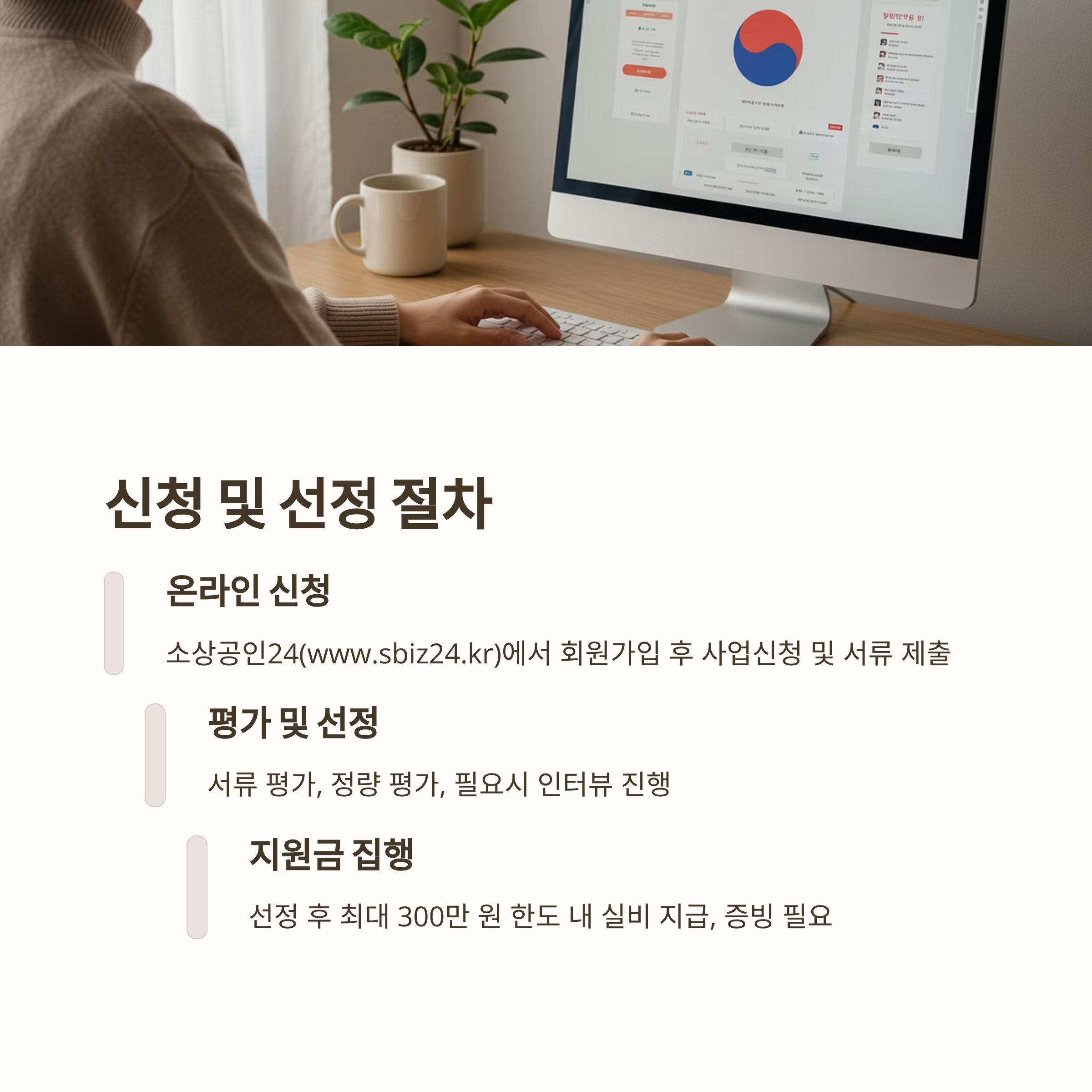 - 신청 방법: 소상공인24 (www.sbiz24.kr) 온라인 접수. 회원가입 후 사업신청 및 서류제출, 평가를 거쳐 선정됩니다. 간단하죠? (소상공인24, 온라인 접수)