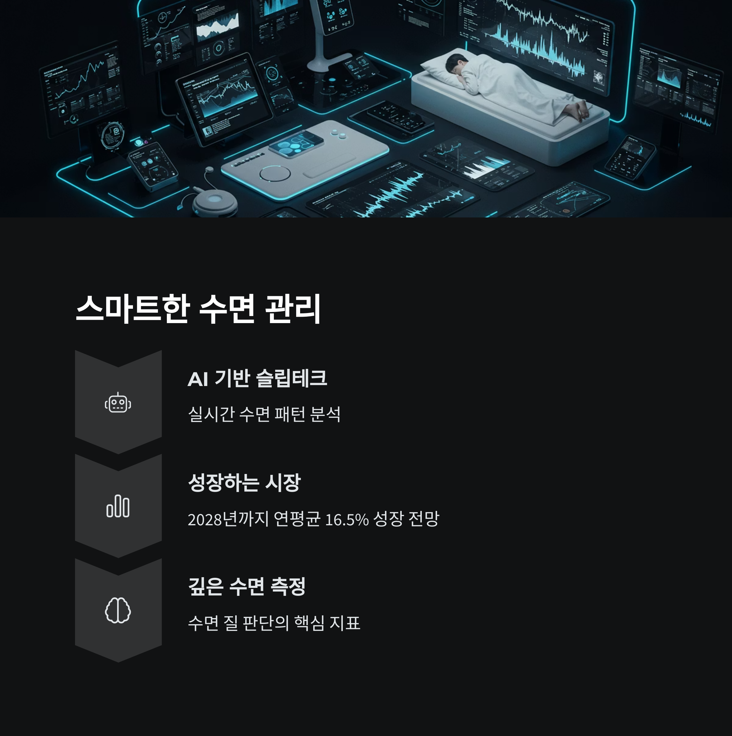 최근에는 기술의 발전으로 수면 관리도 더욱 스마트해지고 있어요. 바로 '슬립테크(Sleep Tech)' 덕분인데요, 인공지능(AI), 사물인터넷(IoT), 빅데이터를 활용한 다양한 스마트 수면 솔루션들이 등장하고 있답니다.