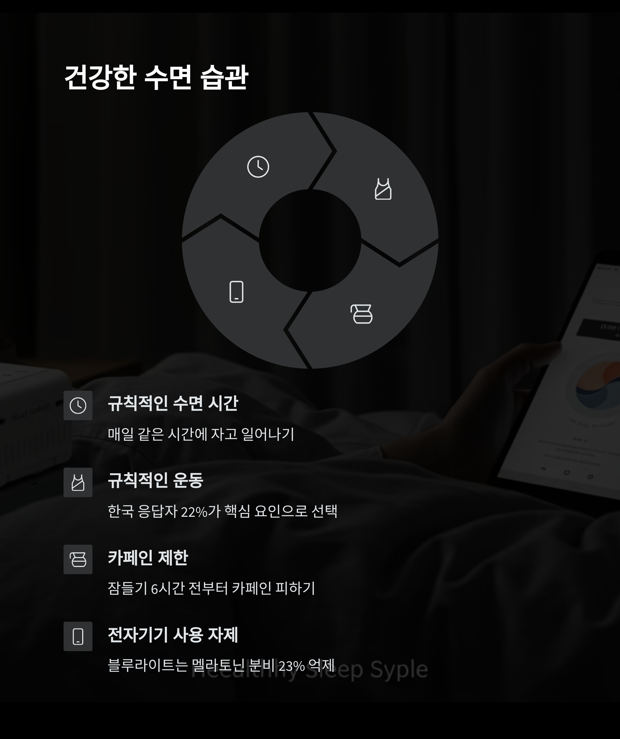 - 스마트한 수면 관리: 필요하다면 슬립테크를 활용하여 나의 수면 패턴을 분석하고 관리해보세요.