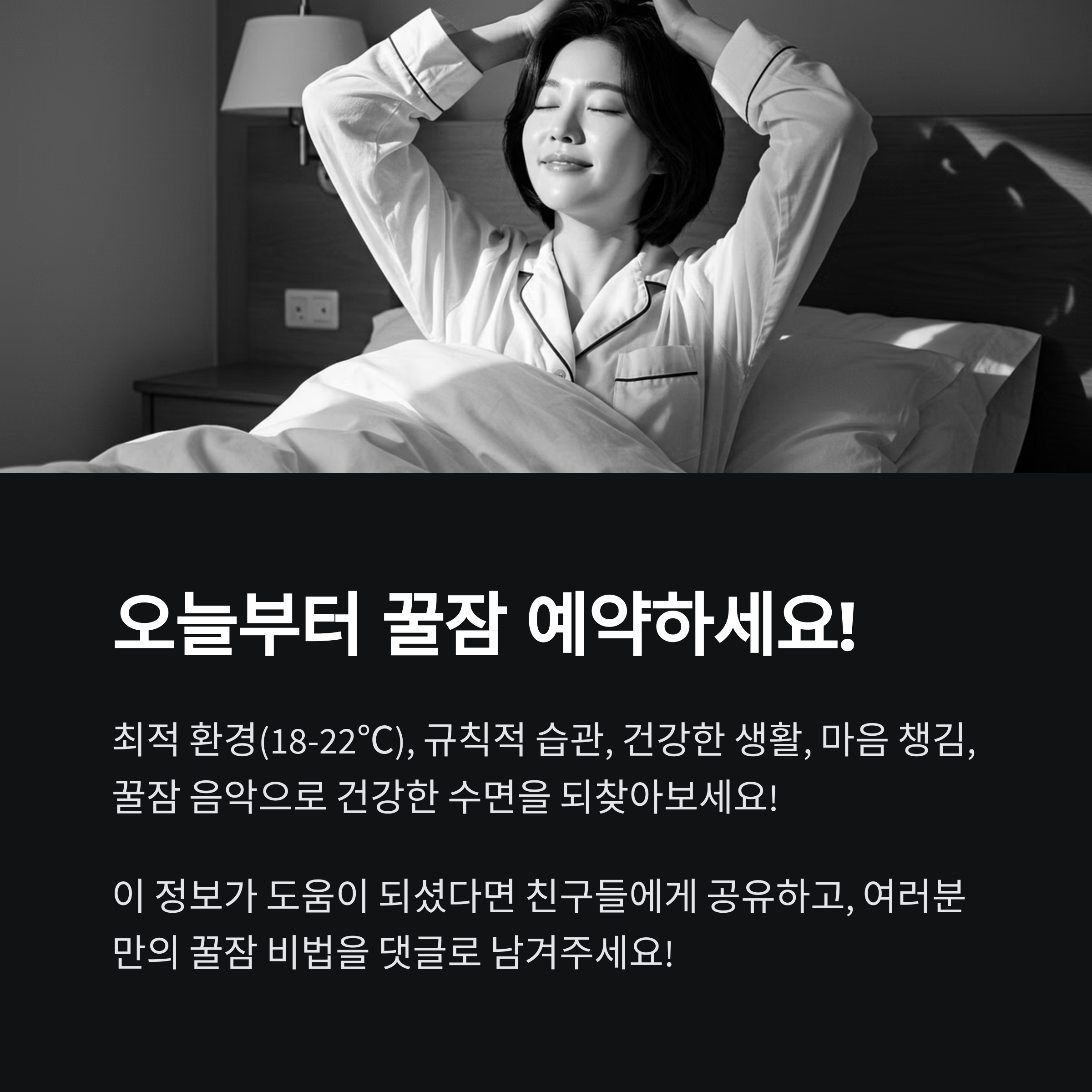 - 쾌적한 수면 환경 조성: 18~22도의 온도, 어둡고 조용한 공간, 편안한 침구는 꿀잠의 기본!