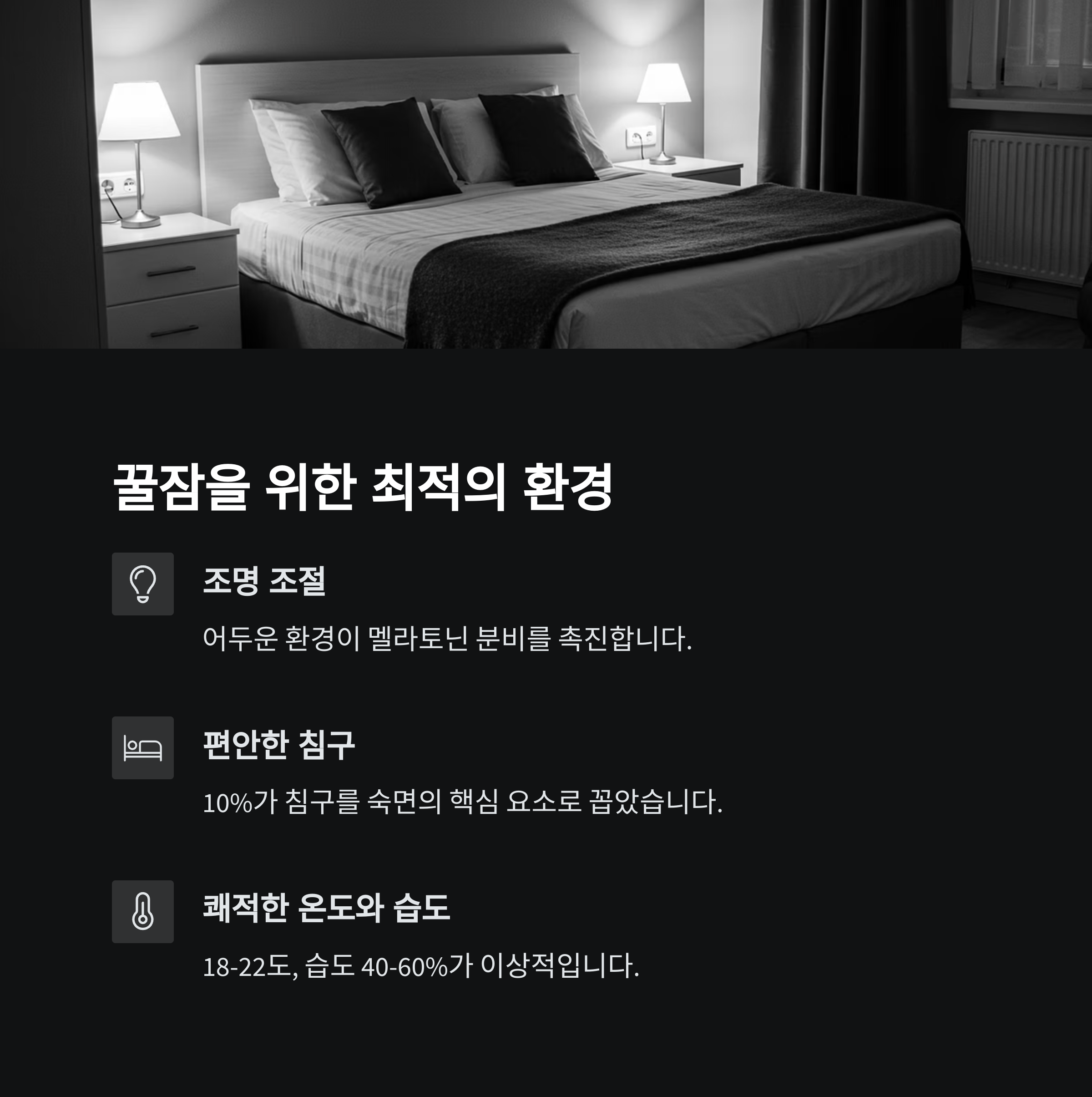 - 일정한 취침 및 기상 시간: 주말에도 평일과 비슷한 시간에 자고 일어나는 것이 정말 중요해요! 규칙성은 수면의 질을 결정하는 핵심 요소로, 전 세계 응답자의 15%, 한국 응답자의 11%가 이를 가장 중요한 숙면 요인으로 꼽았을 정도랍니다.