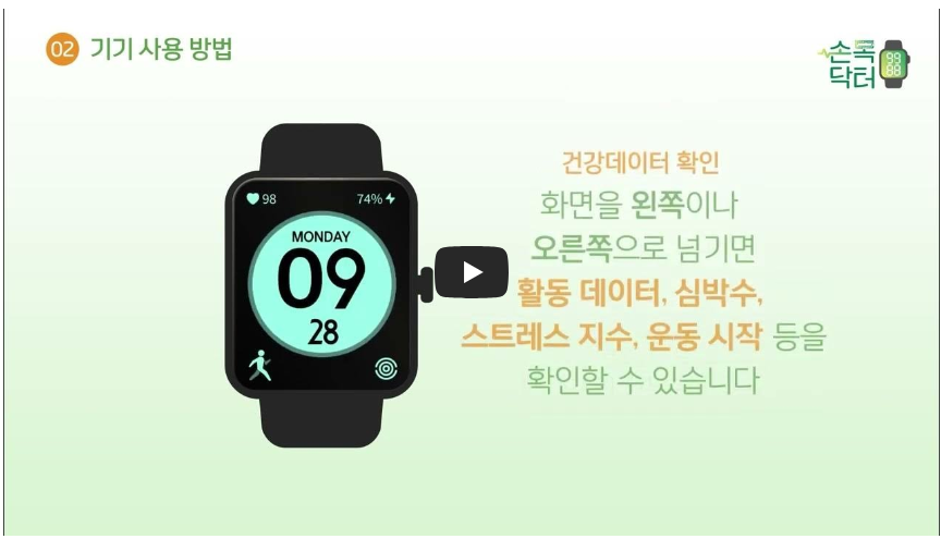 손목닥터9988은 서울시와 보건소가 공동 주관하여 추진하는 스마트 헬스케어 프로그램입니다. 중장년층과 노년층의 건강한 생활습관 형성을 위해 스마트워치를 무료로 지급하고, 걷기 및 운동 실천 포인트를 통해 상품 또는 혜택으로 교환 가능한 포인트 제도를 운영하고 있습니다.