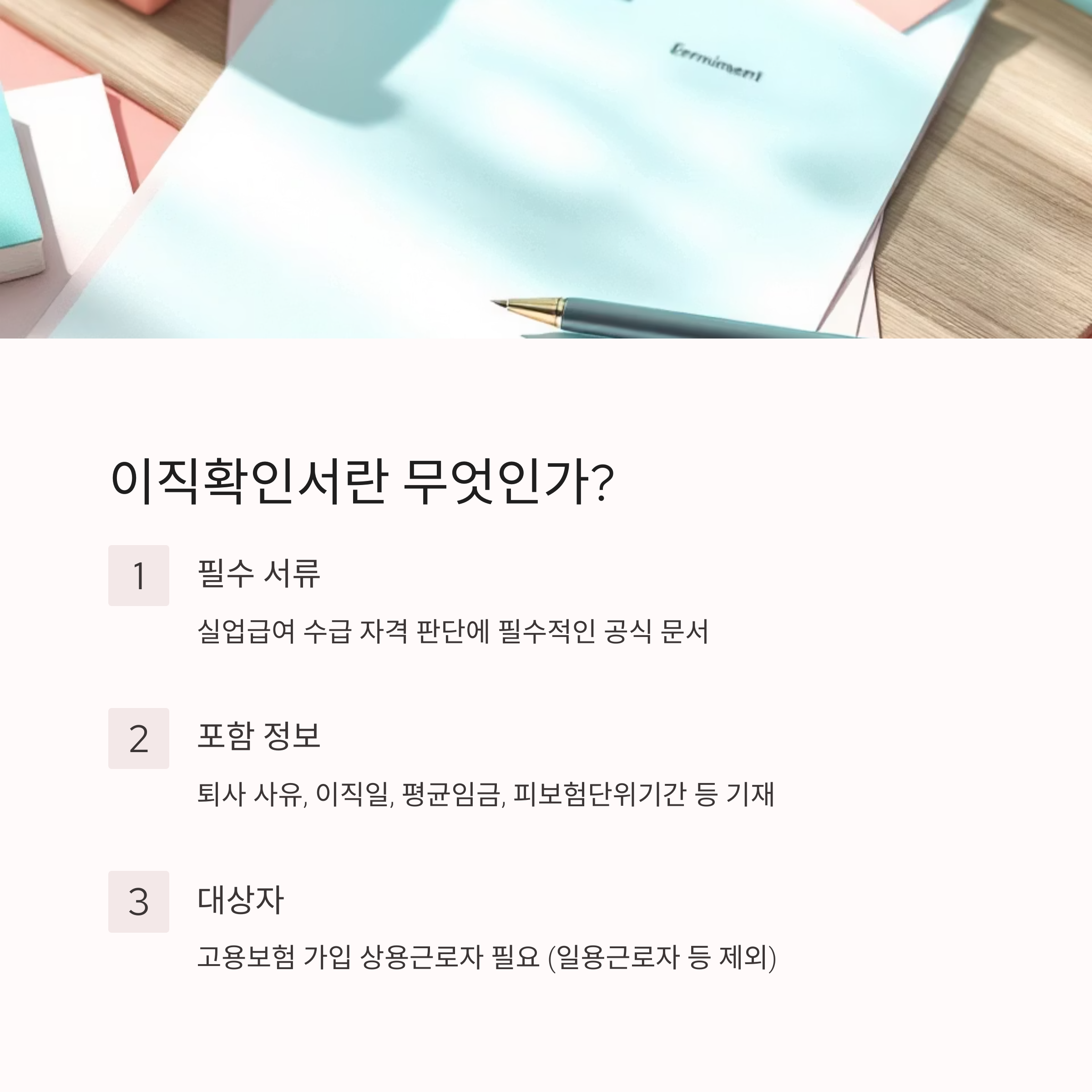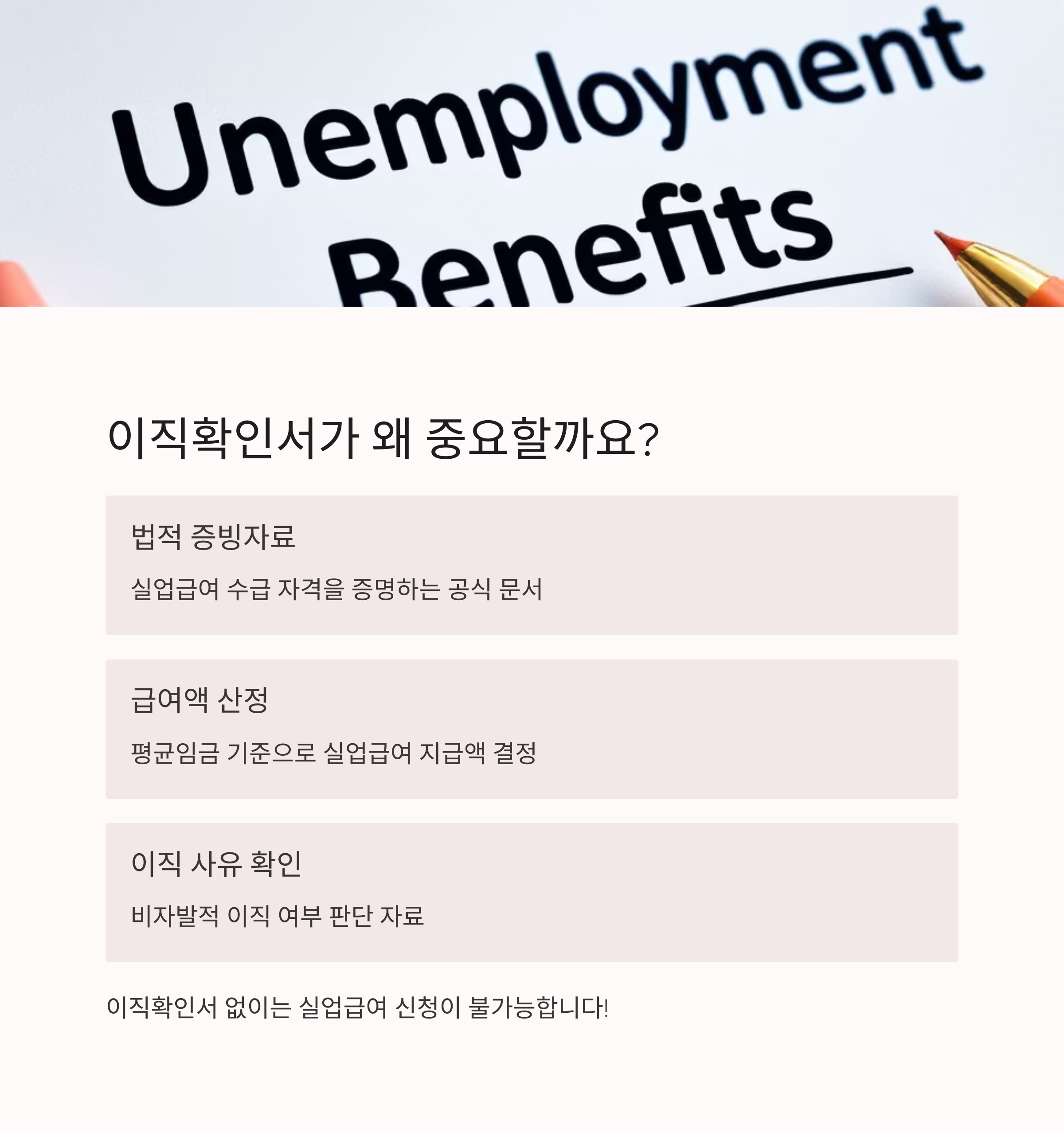 📌 핵심 포인트: 이직확인서는 실업급여를 받기 위한 가장 기본적인 서류이며, 이 서류가 처리되어야만 실업급여 신청이 가능합니다.