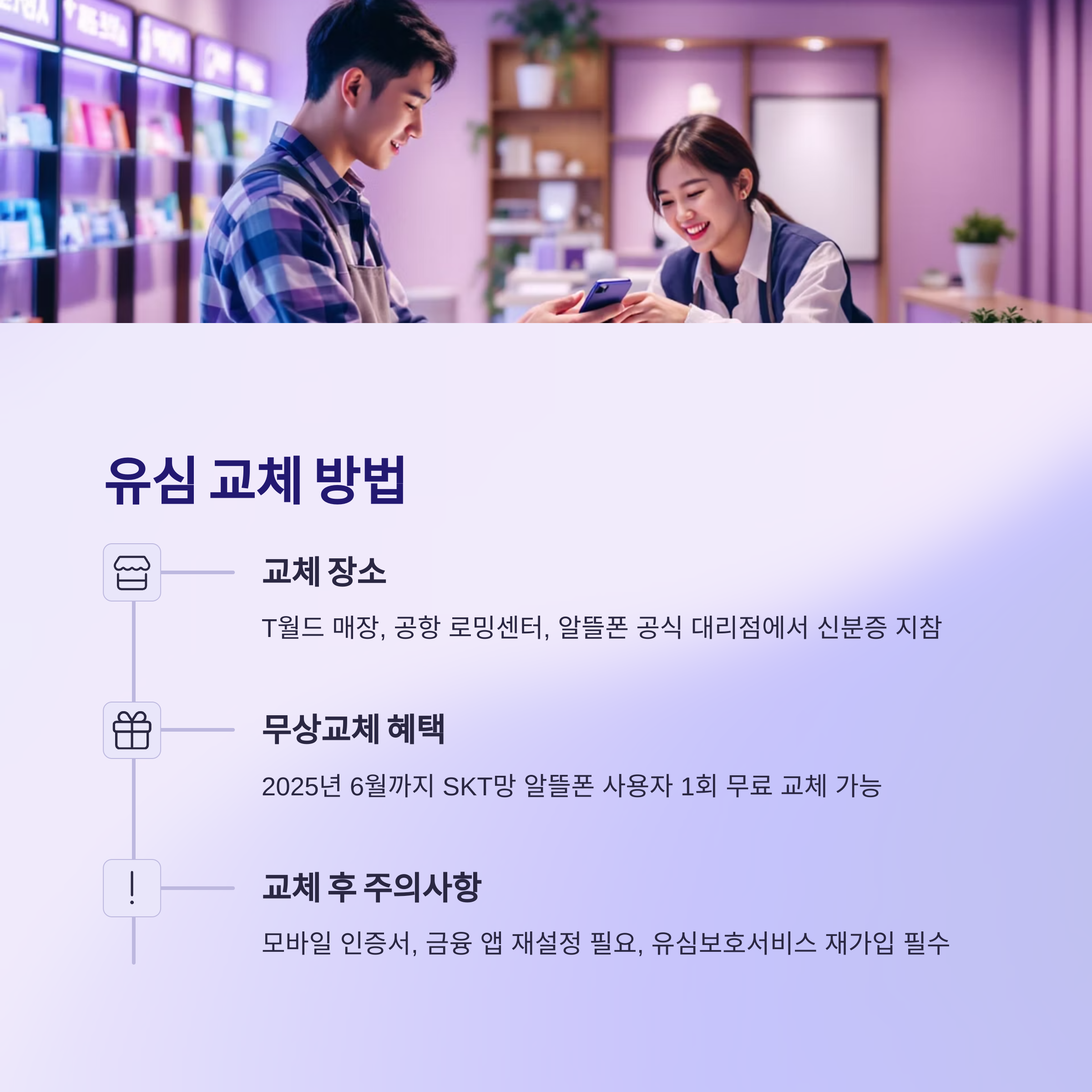 - 유심 교체 시 기존 보호 서비스는 자동 해지되므로, 교체 후 반드시 유심보호서비스에 재가입해야 합니다.