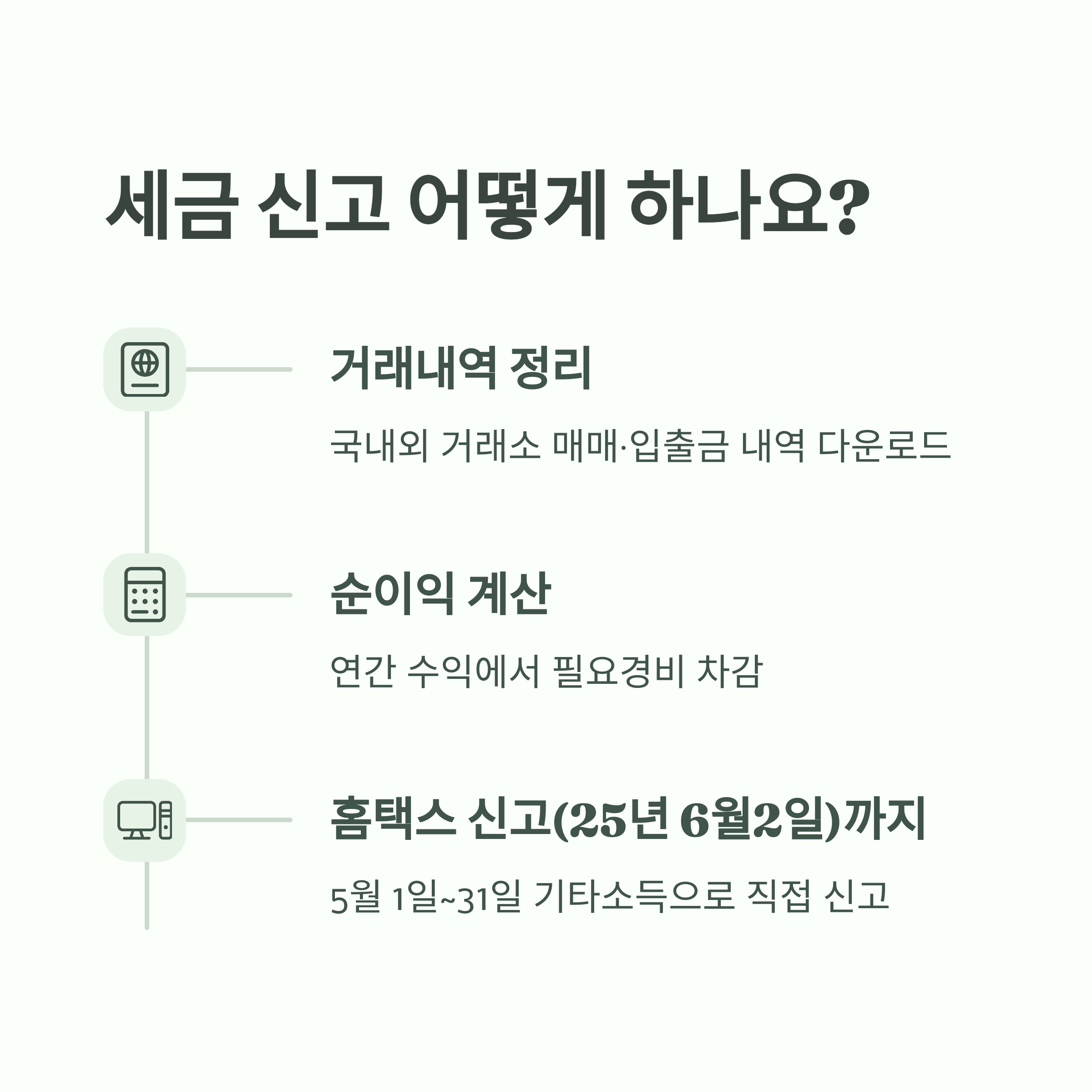 - 신고 기간: 매년 5월 1일~31일 (홈택스 직접 신고). (가상자산 신고 기간)