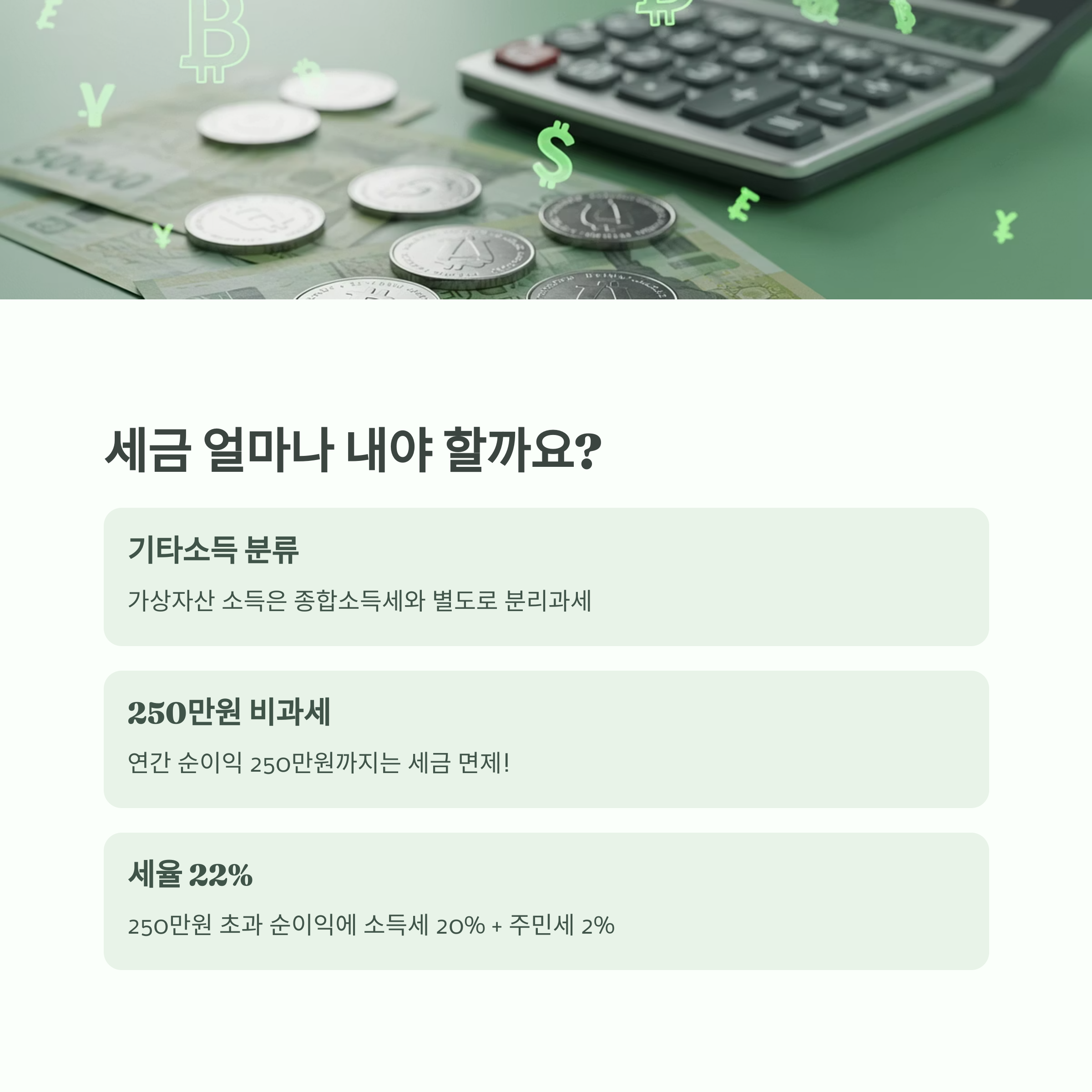 - 세율: 20% + 주민세 2% → 실질 세율 22%가 적용됩니다. (가상자산 세율)
