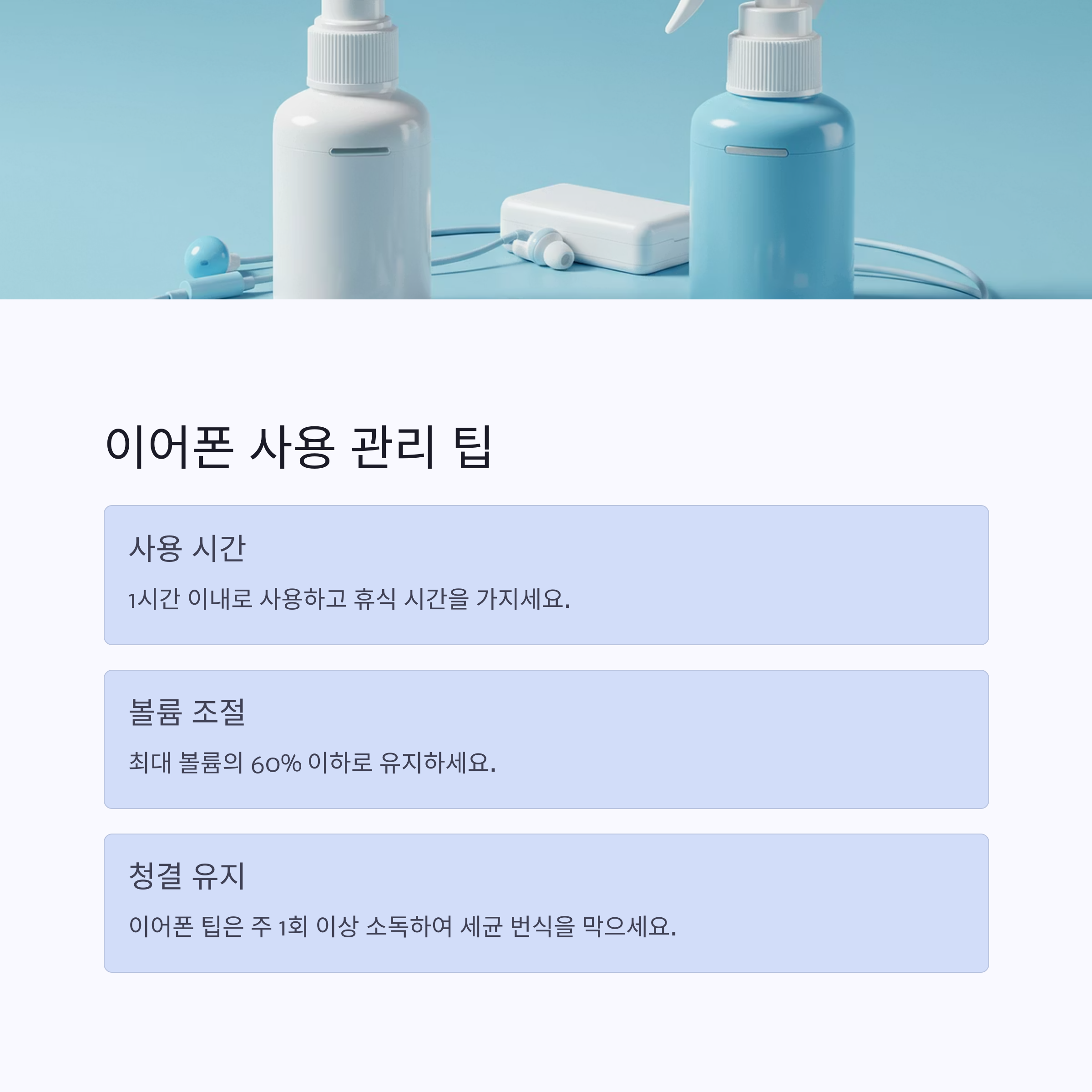 | 이어폰 사용 | 1시간 이내, 볼륨 60% 이하, 주 1회 소독 | 장시간·고음량 사용 시 청력 손상 위험 증가 |
