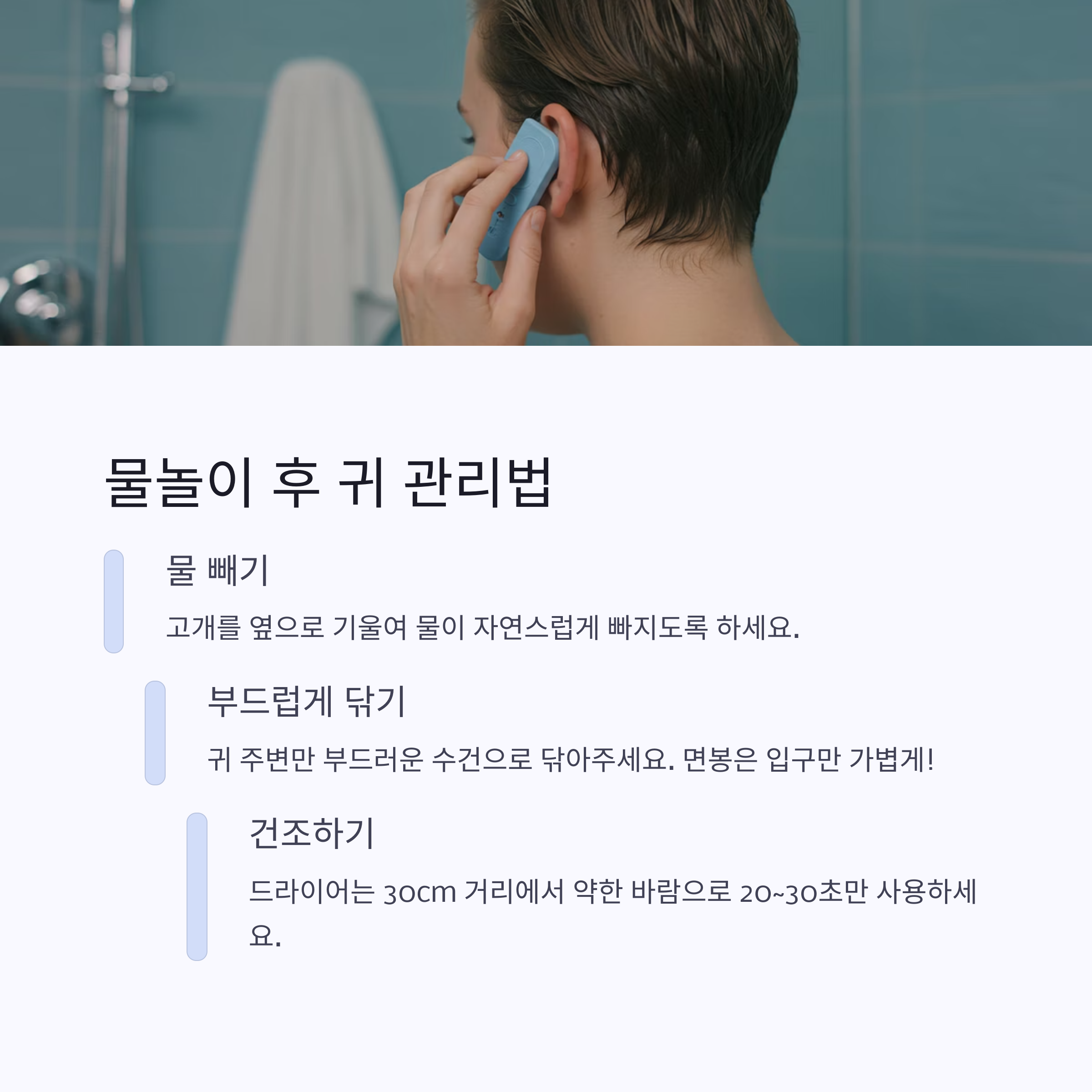 | 물놀이 후 관리 | 귀 주변 닦기, 고개 기울이기, 드라이어 20~30초 약풍 사용 | 면봉 깊숙이 사용 금지, 멸균 면봉 사용 권장 |
