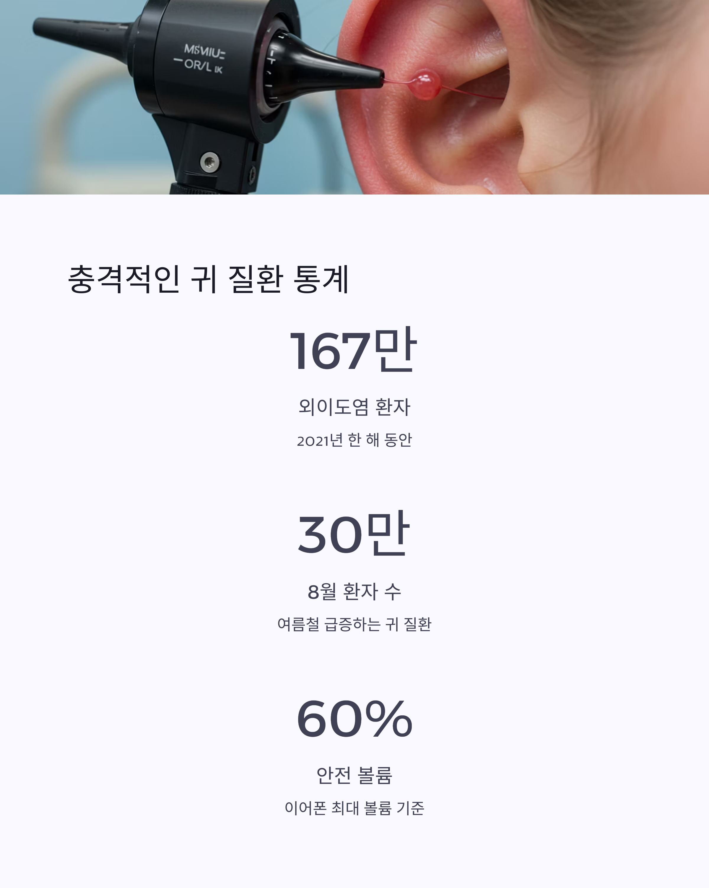 | 외이도염 환자 통계 | 2021년 약 167만 명, 8월 월별 30만 명 이상 | 8월 귀 질환 내원 환자 3명 중 1명이 외이도염 관련 진료 |