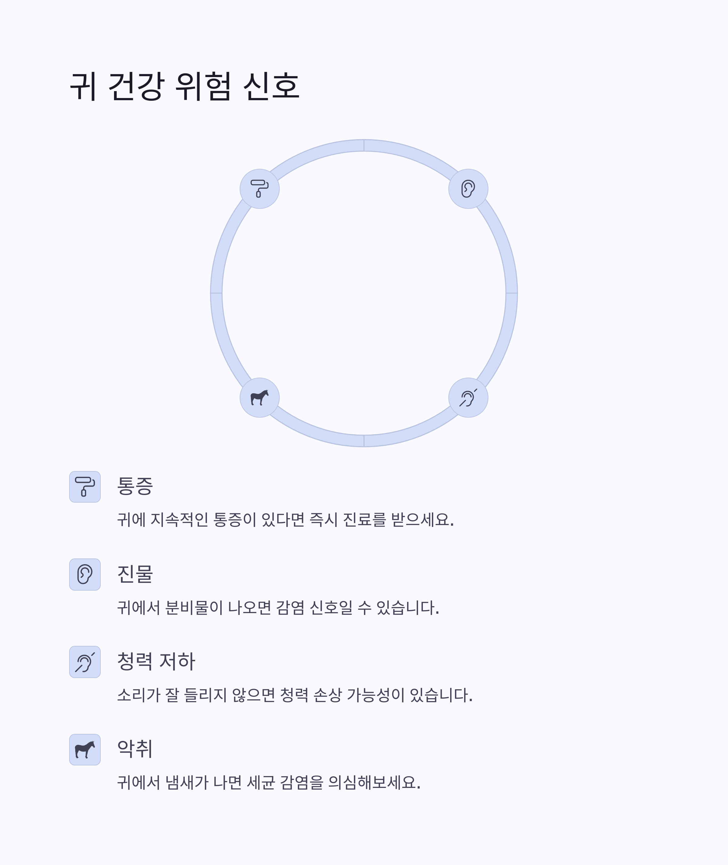 | 이상 증상 | 통증, 진물, 악취, 청력 저하 시 즉시 진료 | 치료 지연 시 만성화, 영구 청력 손상 위험 |