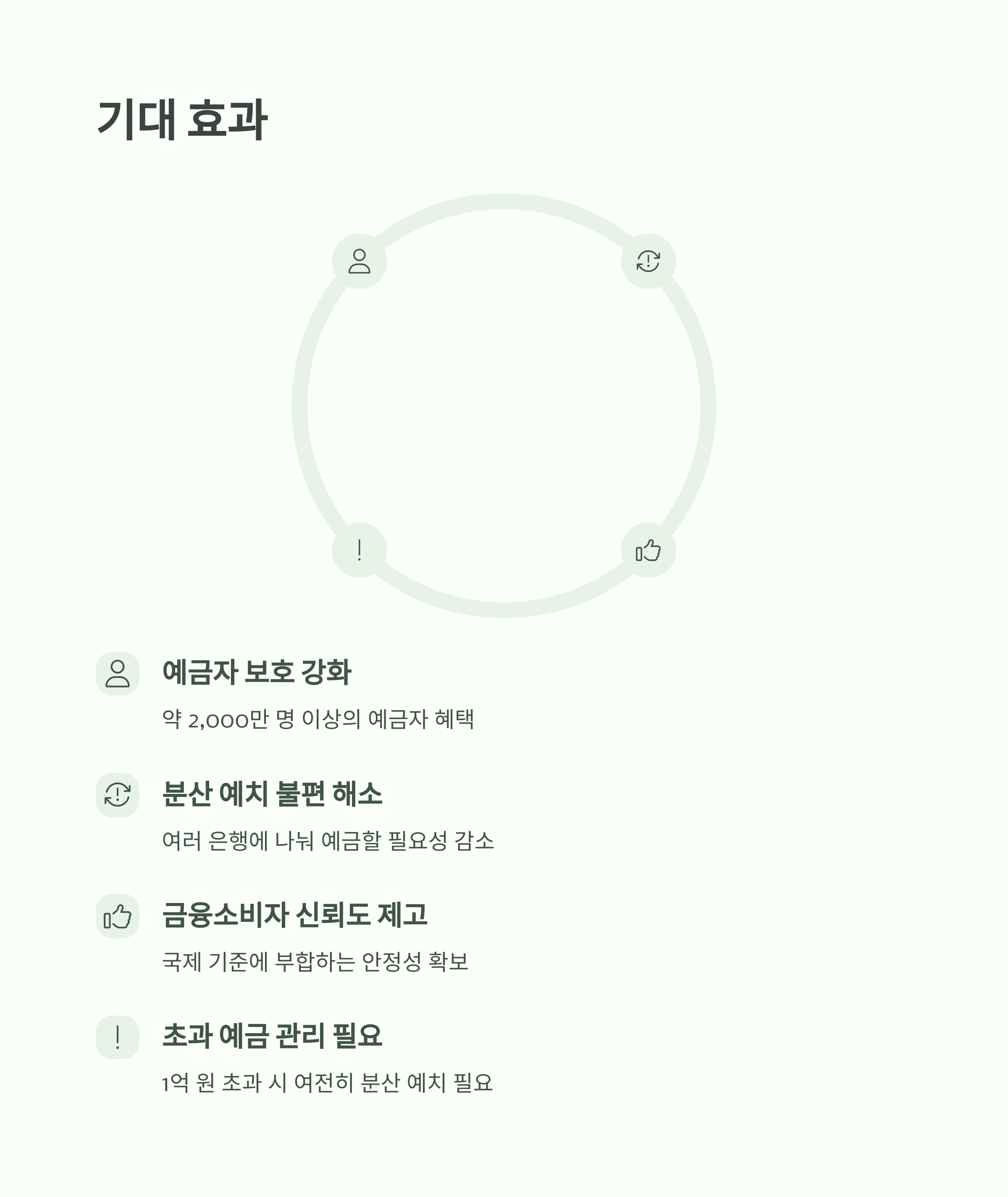 | 5 | 기대 효과 및 유의사항 | 예금자 보호 강화, 분산 예치 불편 해소, 초과 예금 관리 등 |