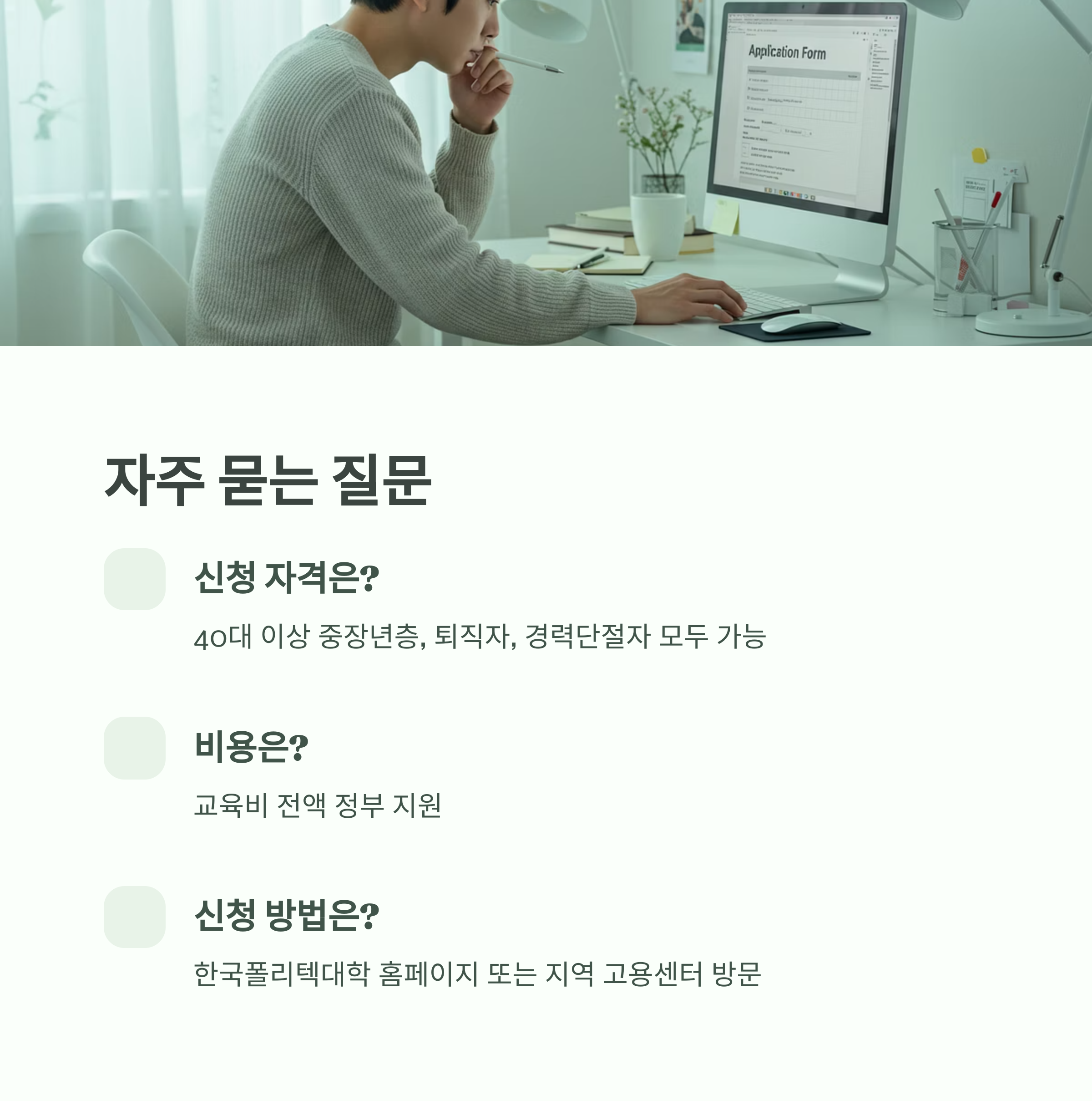 지원 대상은 만 40세 이상 중장년층으로 학력, 경력, 취업 여부에 상관없이 누구나 참여할 수 있다는 점이 가장 큰 변화 중 하나예요. 미취업자뿐만 아니라 영세 자영업자, 비정규직 분들도 모두 대상에 포함됩니다. 운영 기관은 고용노동부와 한국폴리텍대학이며, 무엇보다 참여 비용이 전액 무료라는 게 정말 큰 장점이죠!