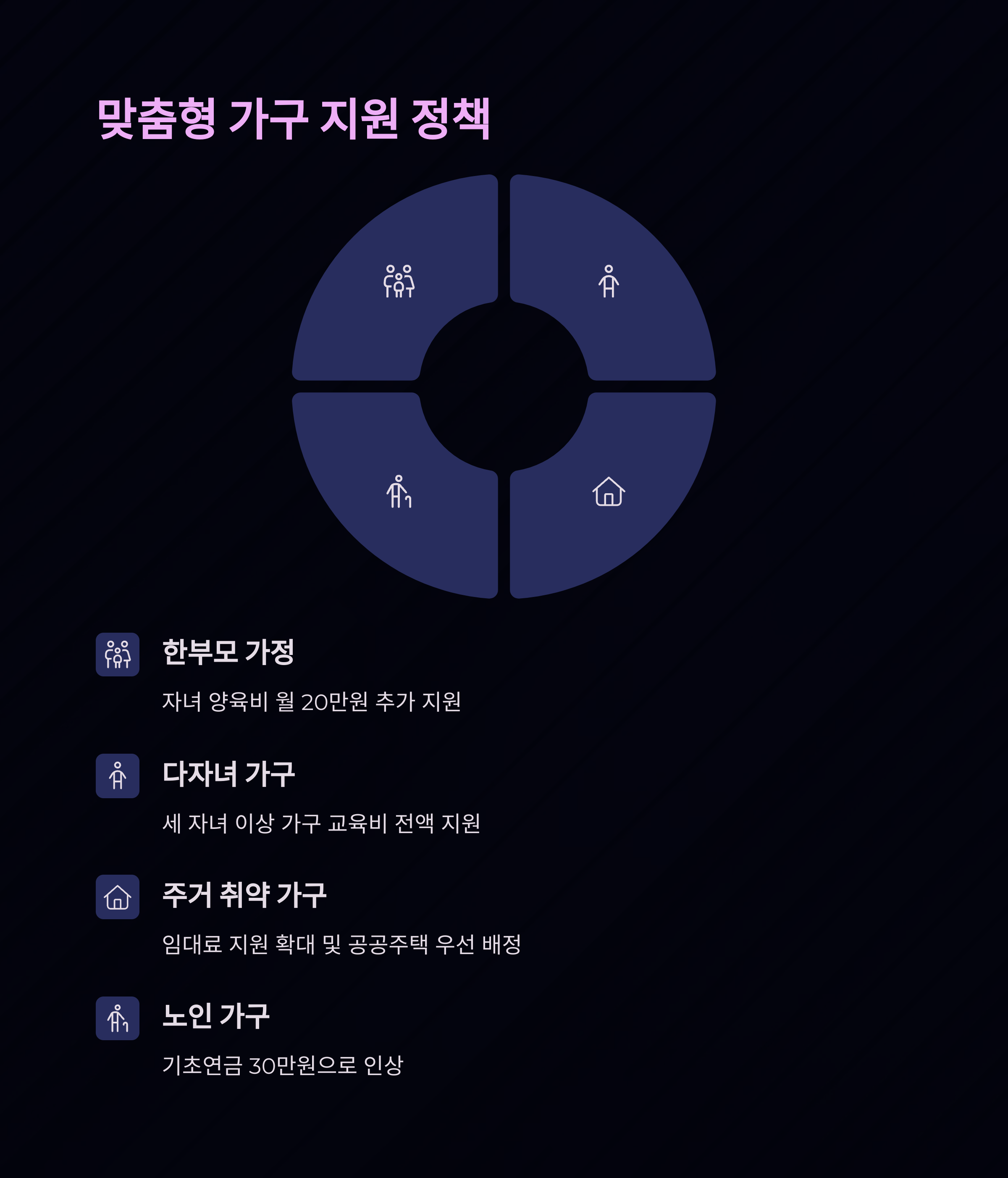 앞서 언급했듯이, 한부모 가족의 어려움은 정말 크죠. 정부는 이런 한부모·다자녀·저소득층을 위한 맞춤형 정책도 강화했어요.