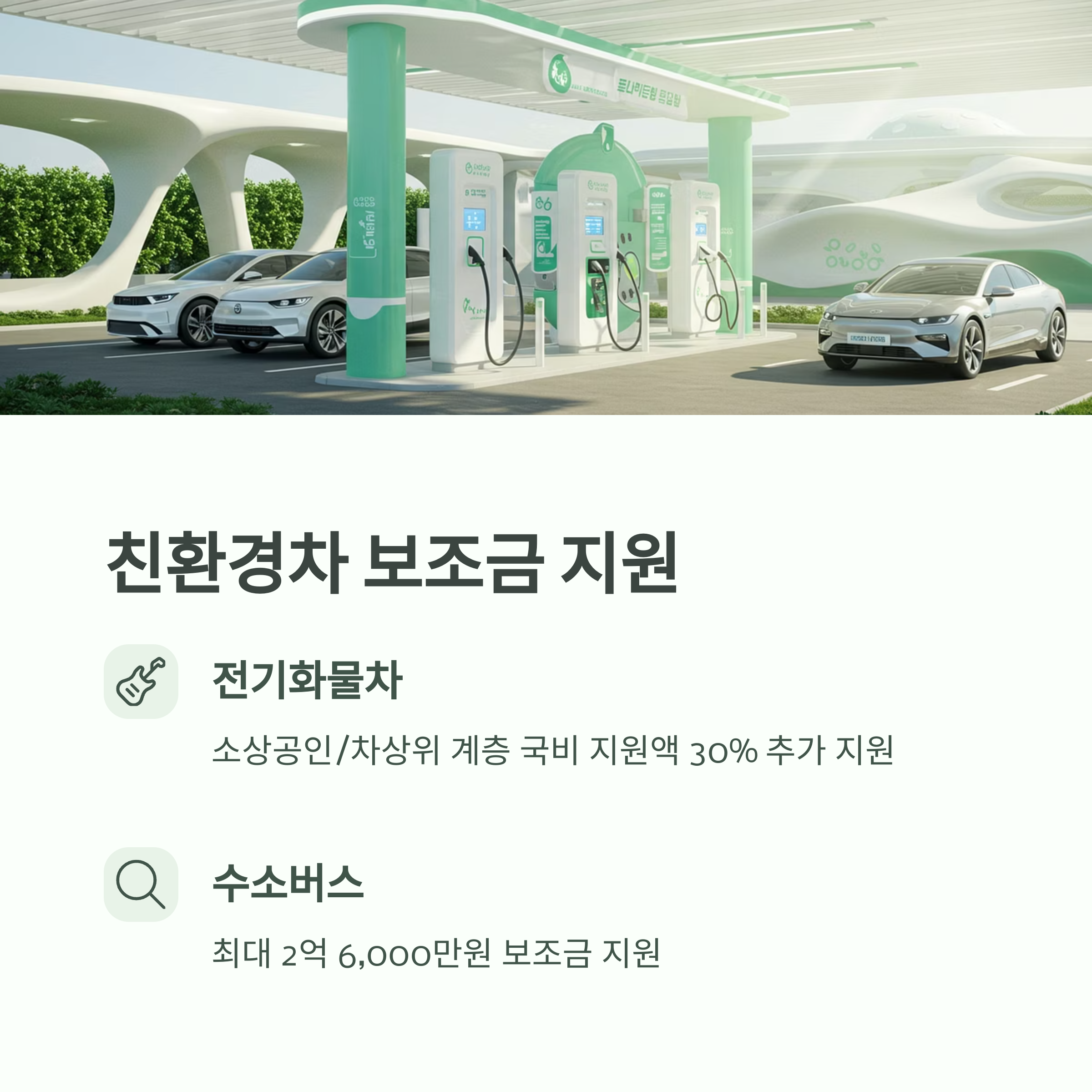 | 전기·수소차 | 친환경차 구매자 | 충전비·보조금 | 국비+지자체 보조금 | 농업인, 소상공인 등 추가 지원 |