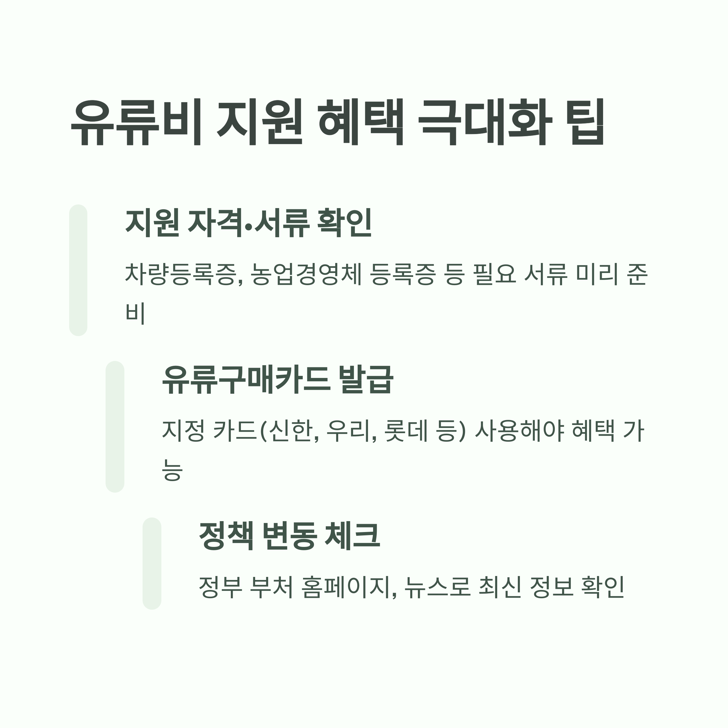 아무리 좋은 정책이라도 제대로 알고 활용하지 못하면 무용지물이죠. 2025년 유류비 지원 혜택을 놓치지 않고 똘똘하게 챙겨갈 수 있는 실전 팁과 유의사항을 알려드릴게요.