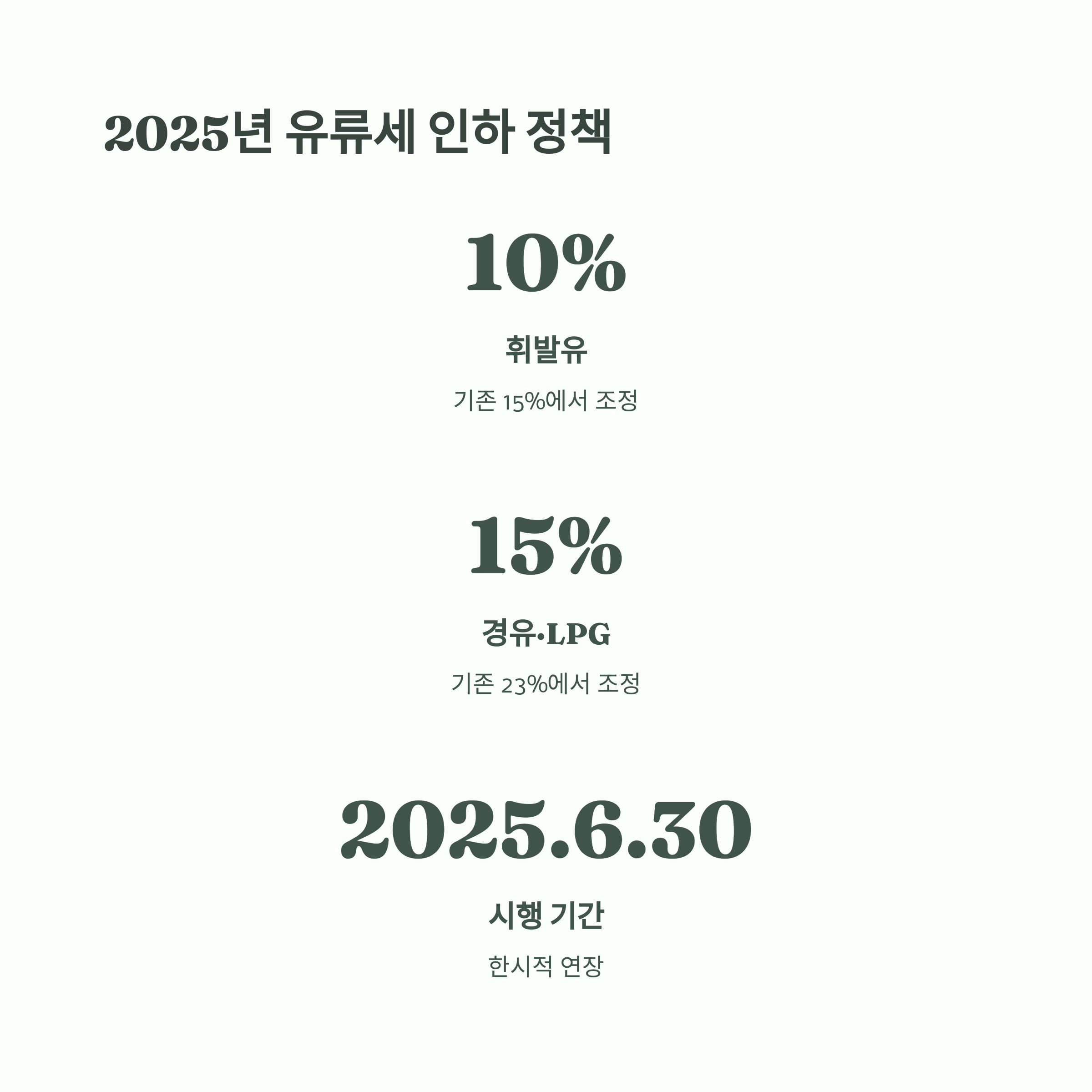 - 유류세 인하 정책의 연장과 변화: 유류세 인하 조치는 2025년 6월 30일까지 연장되었지만, 인하율이 조정되어 유종별로 소폭 인상될 수 있다는 사실을 인지하는 것이 중요합니다.