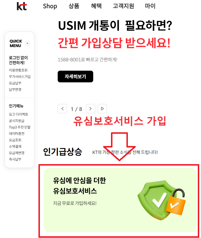 KT 홈페이지 로그인 → [상품] → [모바일] → [부가서비스] → '유심보호서비스' 검색 및 신청