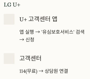 U+ 고객센터 앱 앱 실행 → '유심보호서비스' 검색 → 신청 → 본인 인증 및 약관 동의