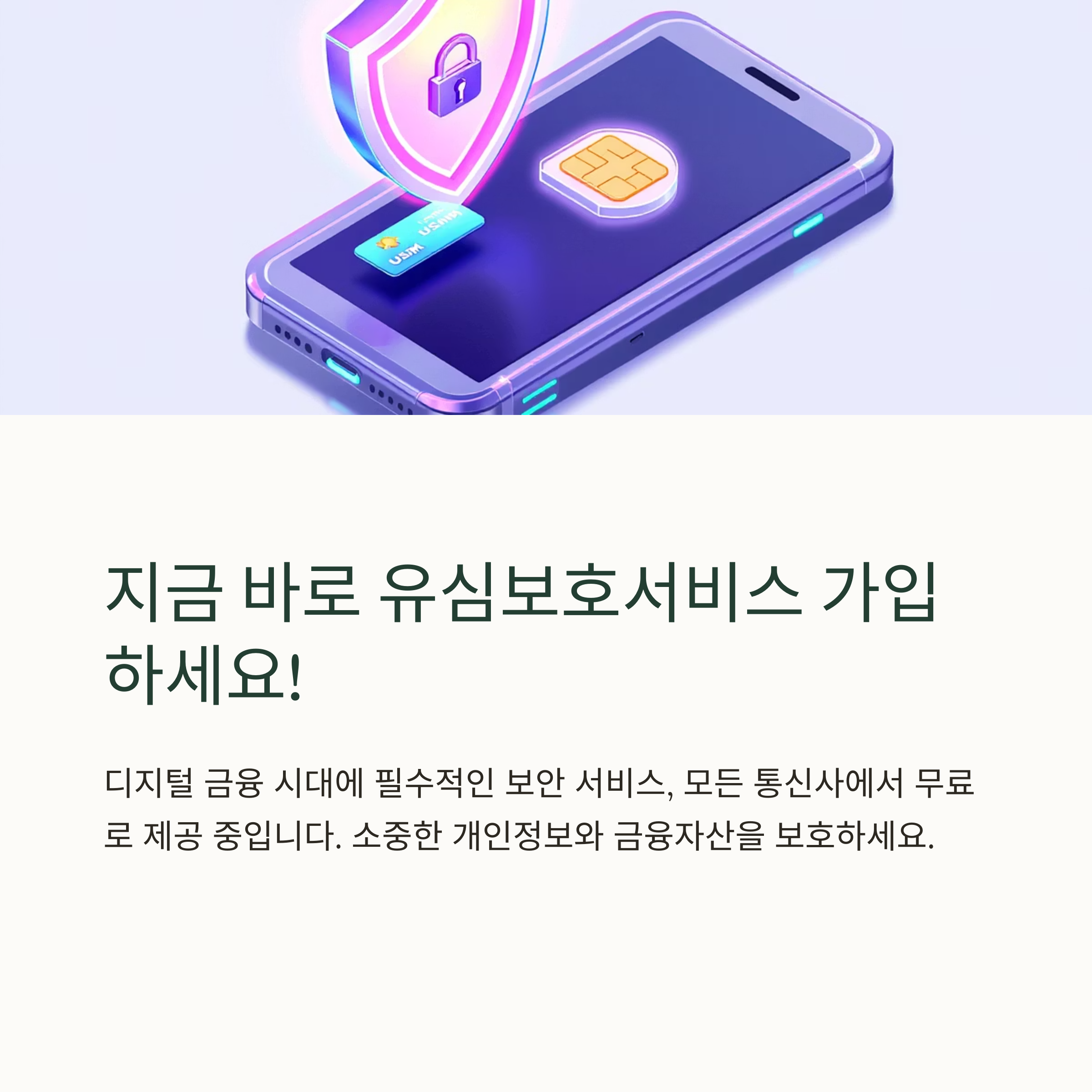 • 유심보호서비스는 모바일 금융, 온라인 쇼핑, 인증 서비스 등을 사용하는 현대인에게 필수적인 보안 장치입니다. 아직 가입하지 않으셨다면, 지금 바로 가입하여 소중한 개인정보와 금융자산을 보호하세요.