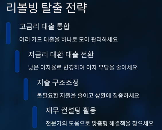 리볼빙 서비스는 위험천만한 금융 함정입니다. 가능한 한 빨리 벗어나는 것이 최선의 선택입니다.