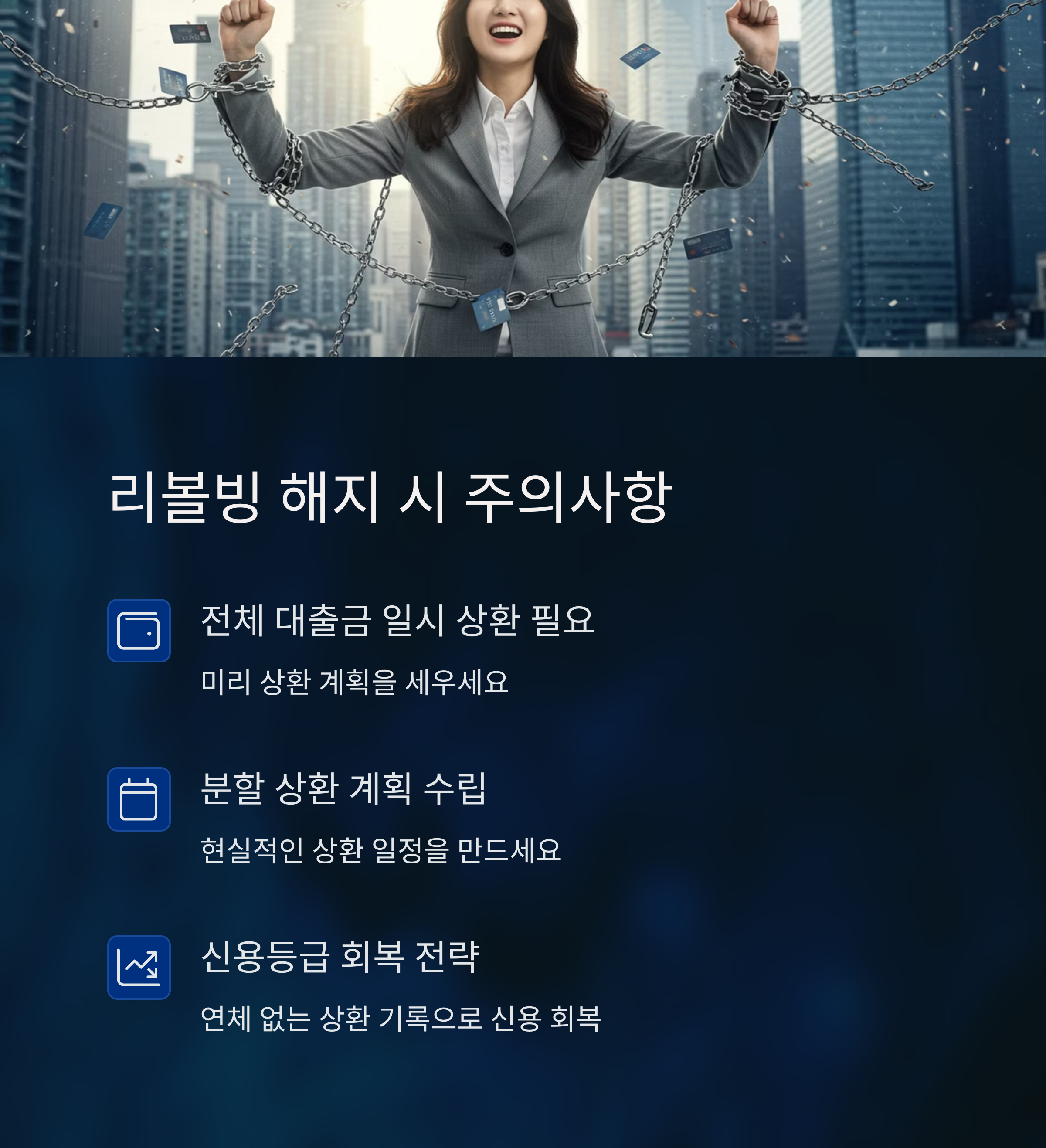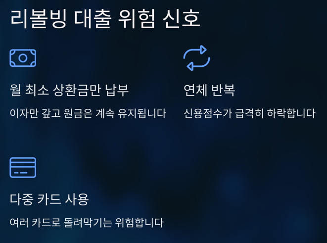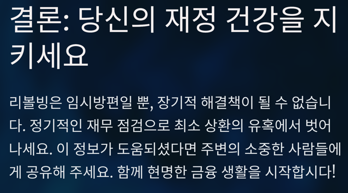 - 리볼빙 결제는 최대한 자제하고, 불가피하게 이용해야 할 경우 최소한으로 사용해야 합니다.