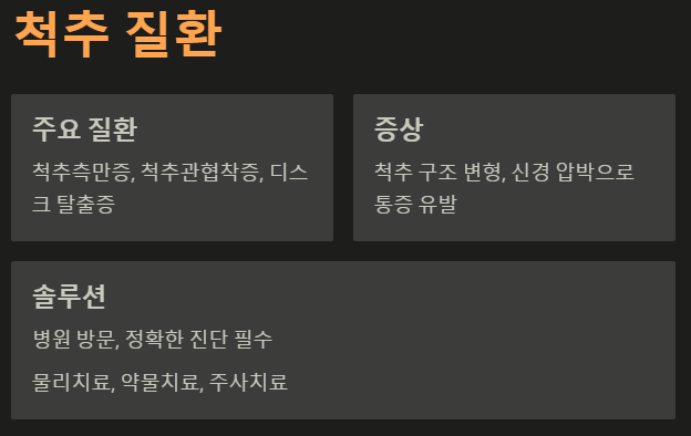 - 원인: 척추측만증, 척추관협착증, 디스크 탈출증 등은 척추 구조 변형 및 신경 압박을 유발하여 통증을 일으킵니다.