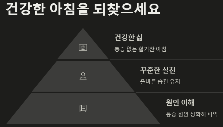아침 등 통증은 삶의 질을 떨어뜨리는 불청객입니다. 하지만 올바른 생활 습관과 꾸준한 노력으로 충분히 극복할 수 있습니다. 더 이상 통증에 괴로워하지 마시고, 건강한 아침을 맞이하세요!