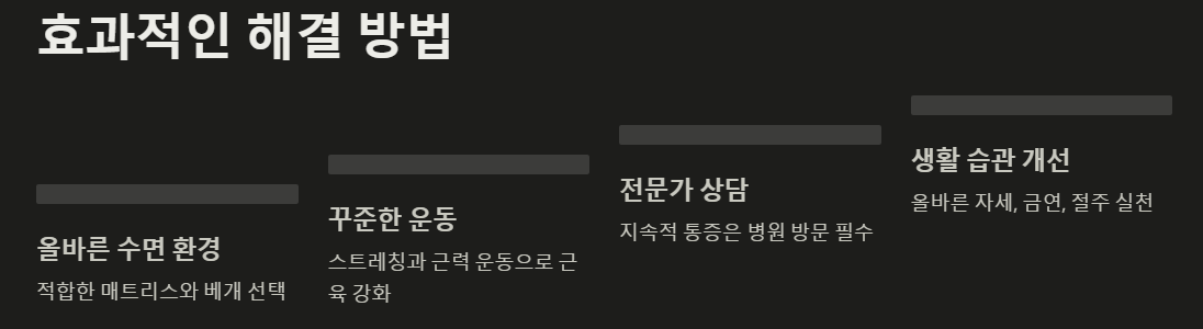 - 꾸준한 스트레칭과 근력 운동: 굳어진 근육을 풀어주고 척추를 지지하는 근력을 강화하는 운동을 꾸준히 합니다.