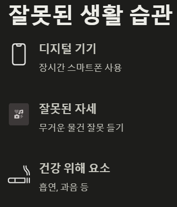 • 원인: 무거운 물건을 잘못된 자세로 들거나, 장시간 스마트폰 사용, 흡연, 과음 등은 척추 건강을 해칩니다.