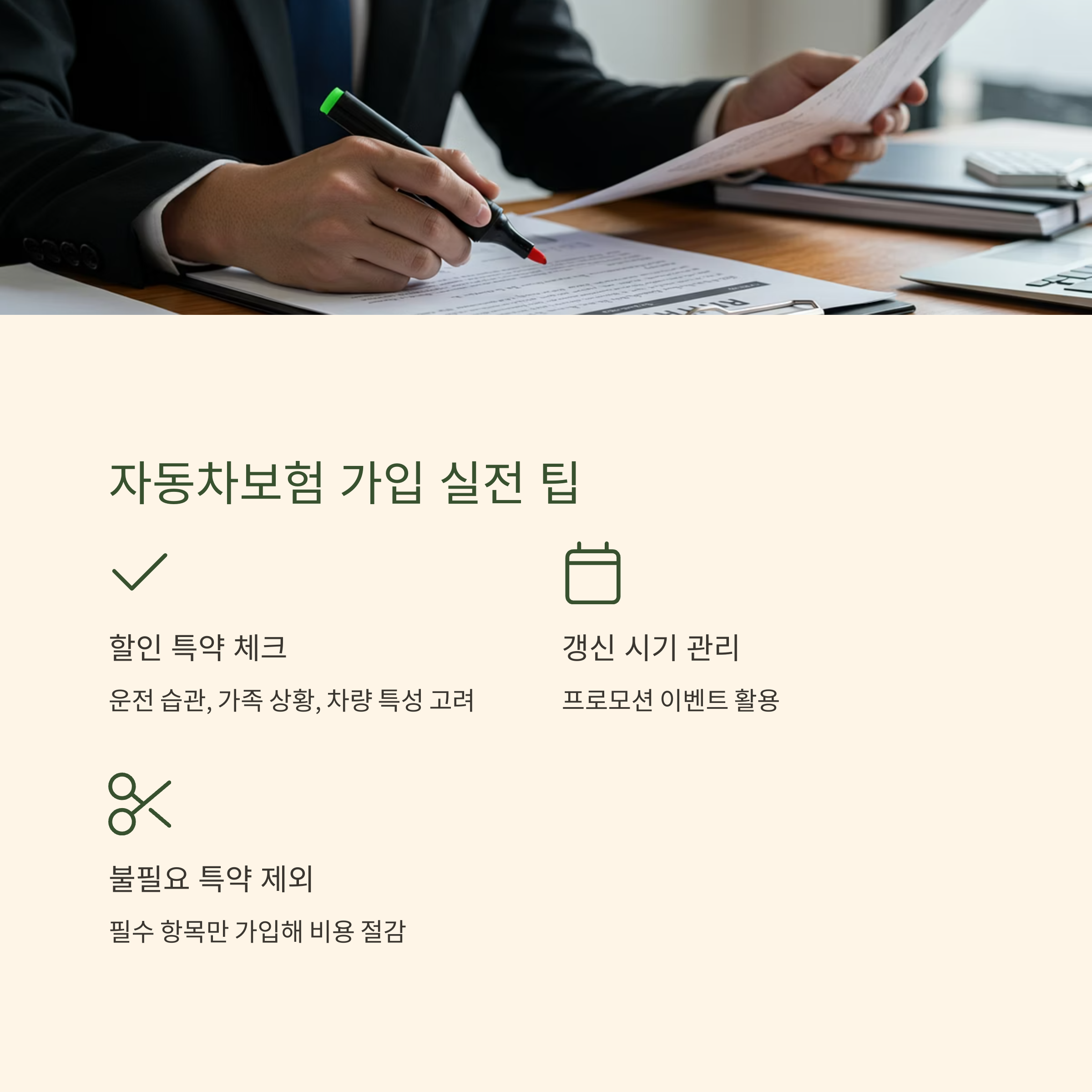 - ✔️ 자동차보험 필수 가입 항목 외에 불필요한 특약은 과감히 제외하여 차량 유지비를 절감할 수 있습니다.