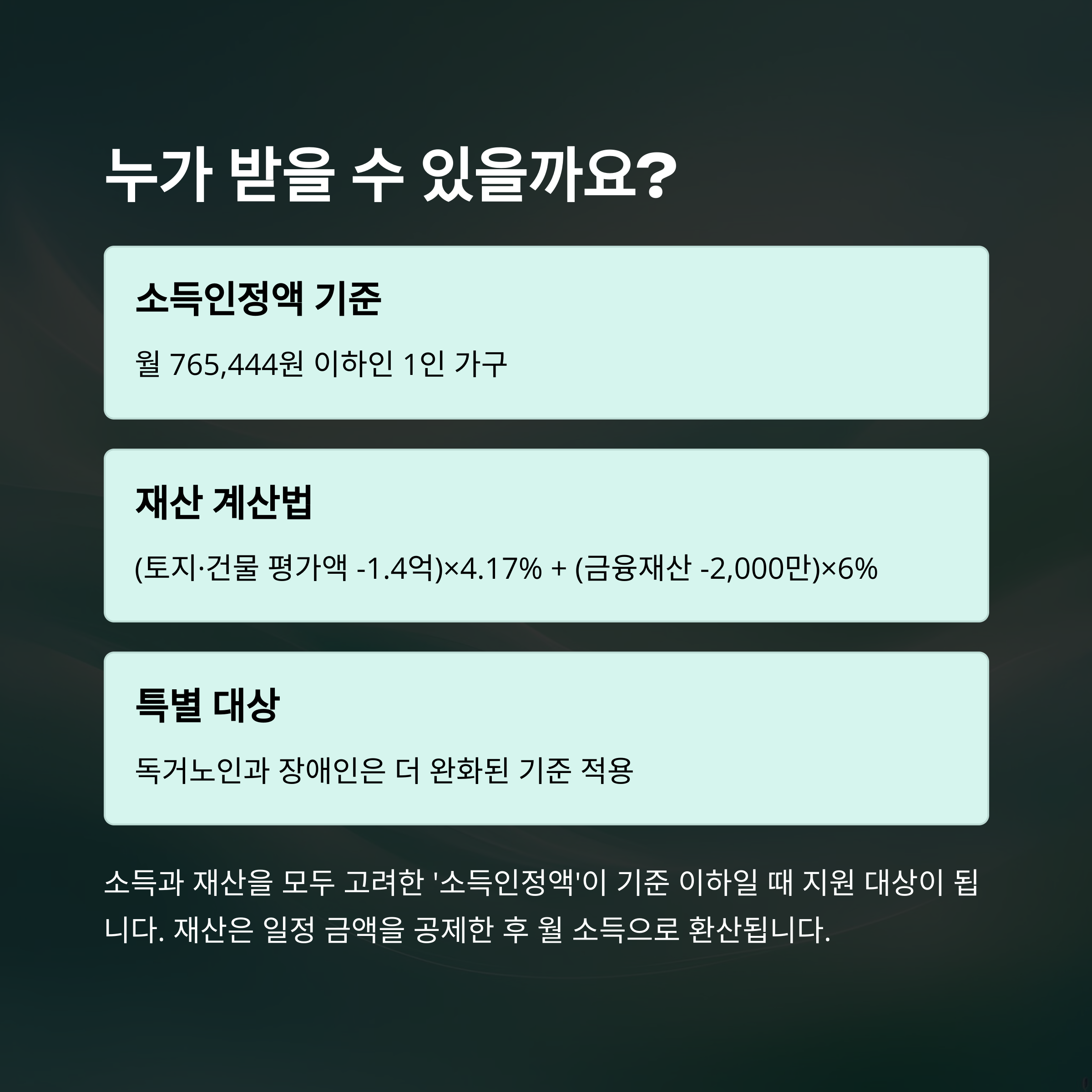 ⭐ 2025년 변경사항: 2025년부터 노인 1인가구의 경우 부양의무자 기준이 더욱 완화되었습니다. 만 70세 이상 노인은 부양의무자 재산 기준이 적용되지 않습니다.