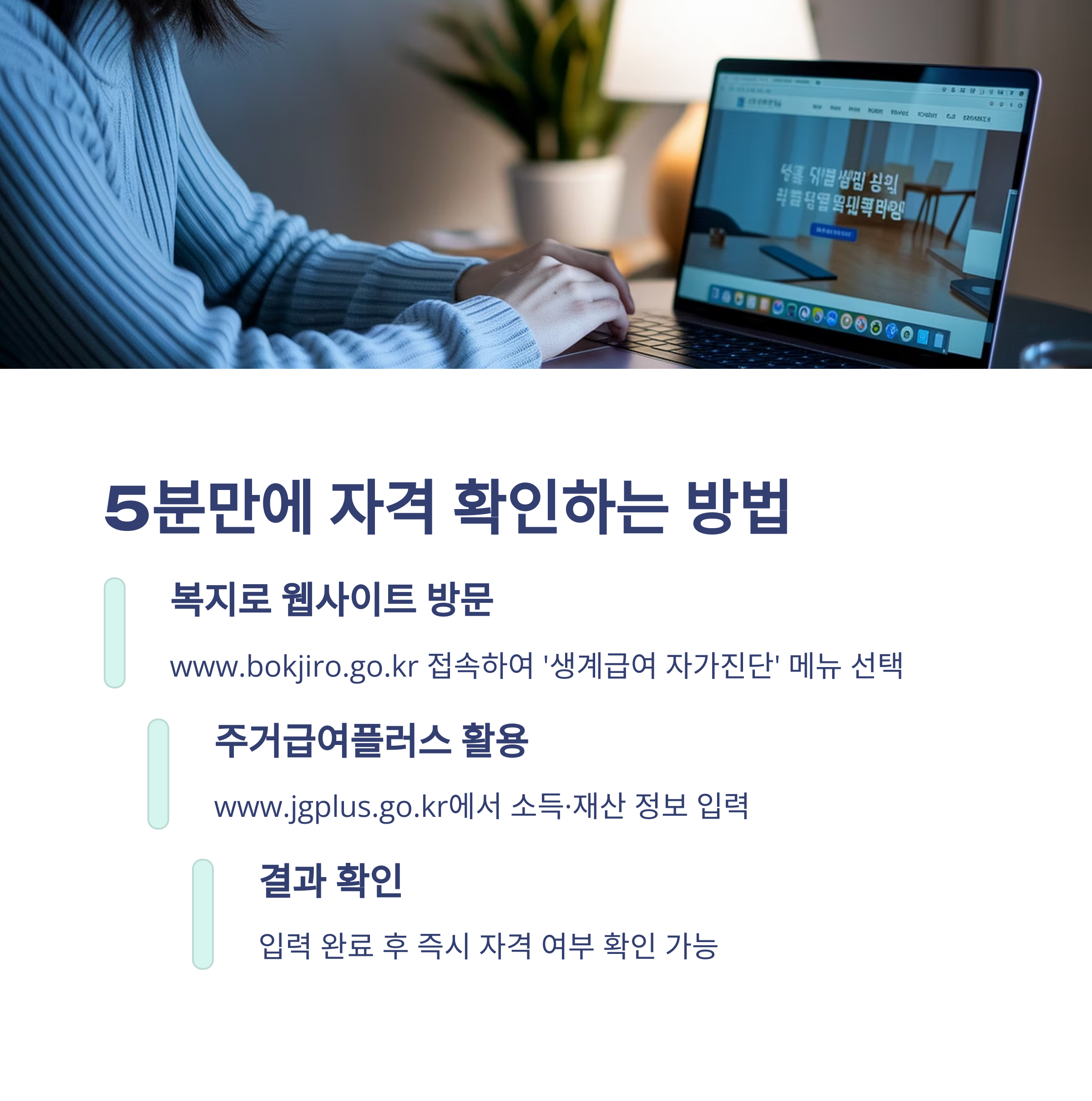💻 주거급여플러스(www.jgplus.go.kr)에서도 주거급여와 함께 생계급여 수급 가능성을 확인할 수 있습니다. 두 사이트 모두 회원가입 없이 이용 가능합니다!