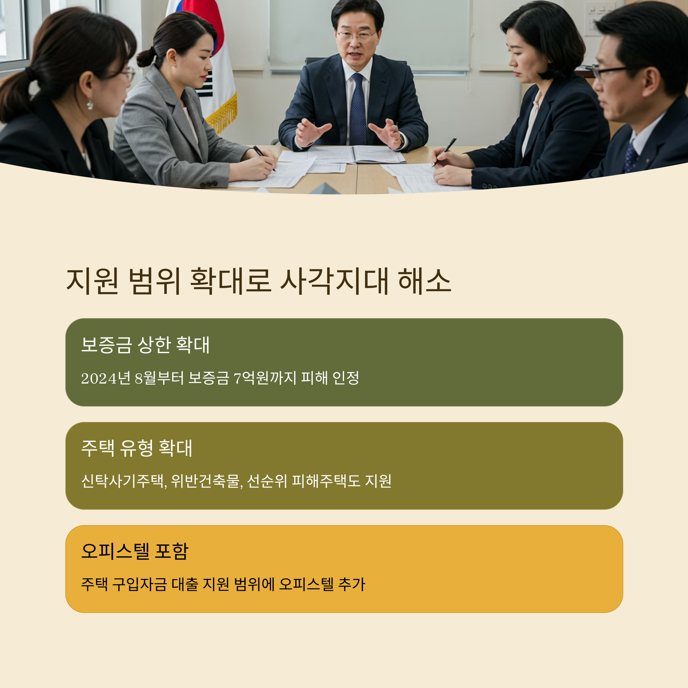 • ✔️ 지원 범위 확대: 보증금 7억 원까지, 신탁사기·위반건축물·오피스텔까지 포괄