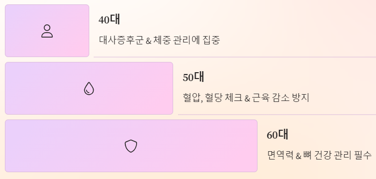 - 50대: 만성질환 시작, 근육량 감소 가속화