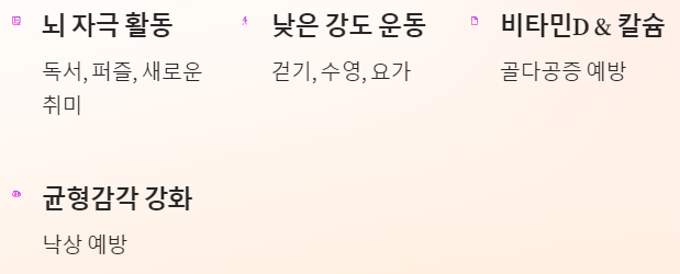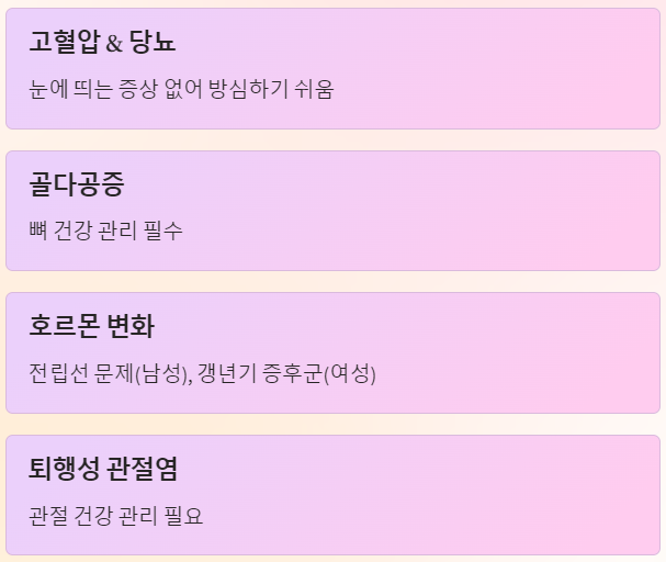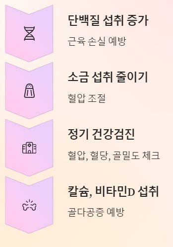 - 정기 건강검진 필수 - 특히 혈압, 혈당, 골밀도 체크