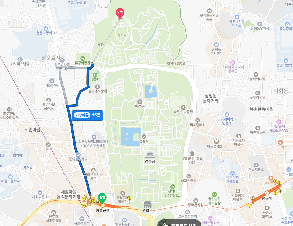 - 3호선 경복궁역 3번·4번 출구: 청와대까지 도보로 약 15분 소요