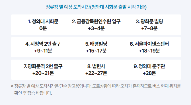 셔틀버스 꿀팁: 혼잡 시간대에는 대기 시간이 길어질 수 있으니, 셔틀버스 도착 시간 10분 전에 정류장에 도착하는 것이 좋습니다. 청와대 관람 후 교통편으로도 셔틀버스를 이용할 수 있습니다.