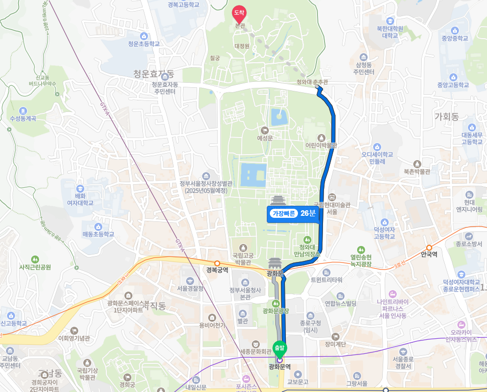 - 5호선 광화문역 1번 출구: 도보로 약 25분 소요