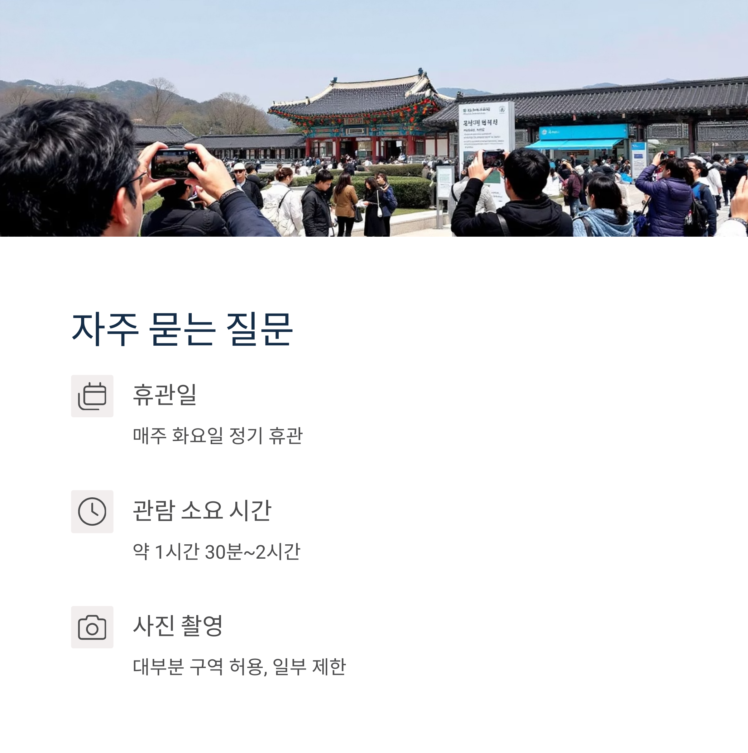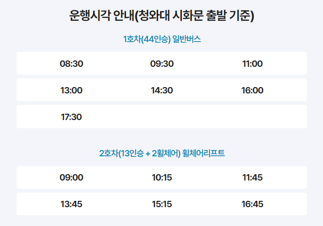 | 셔틀버스 | 경복궁역 4번 출구~청와대, 09:00~17:00, 30분 간격 |