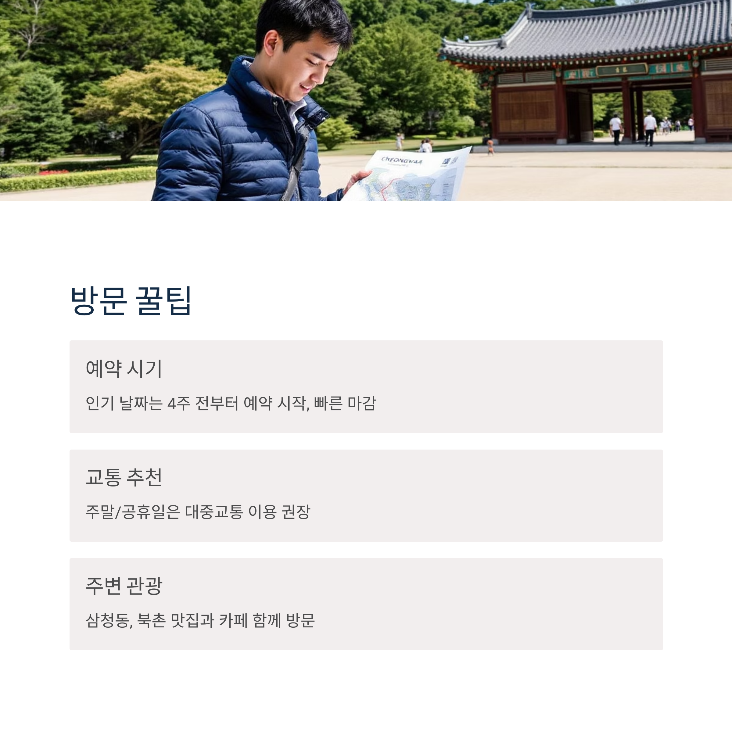 2025년 청와대 예약 꿀팁: 주말과 공휴일은 예약이 빨리 마감되니, 최소 2~3주 전에 예약하는 것이 좋습니다. 특히 청와대 봄 관람과 청와대 가을 관람 시즌에는 더욱 경쟁이 치열합니다.