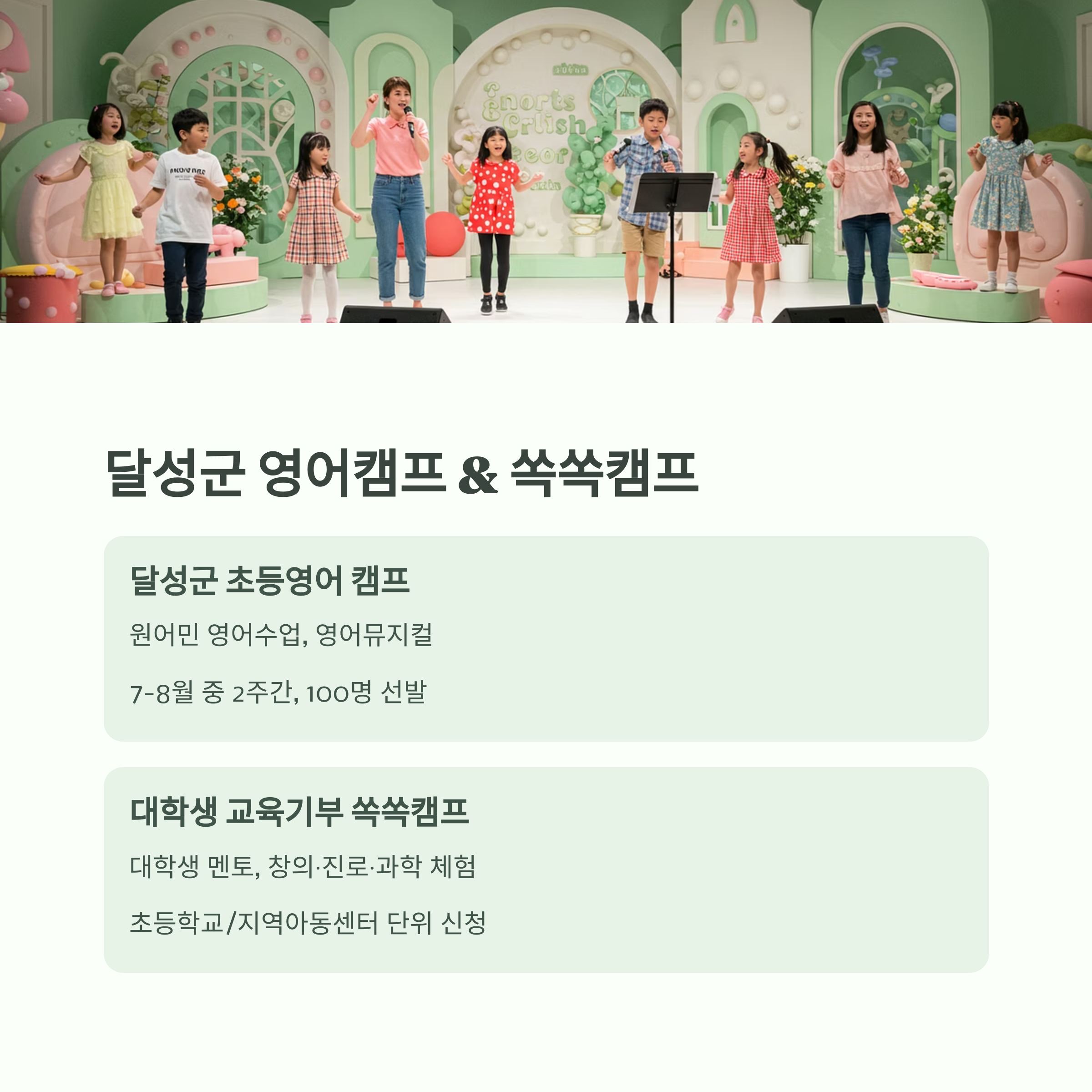 | 달성군 영어캠프 | 초등, 100명 | 7~8월/2주 | 6월 중(재단 홈페이지) | 무료 | 원어민 영어, 영어뮤지컬, 체험활동 |