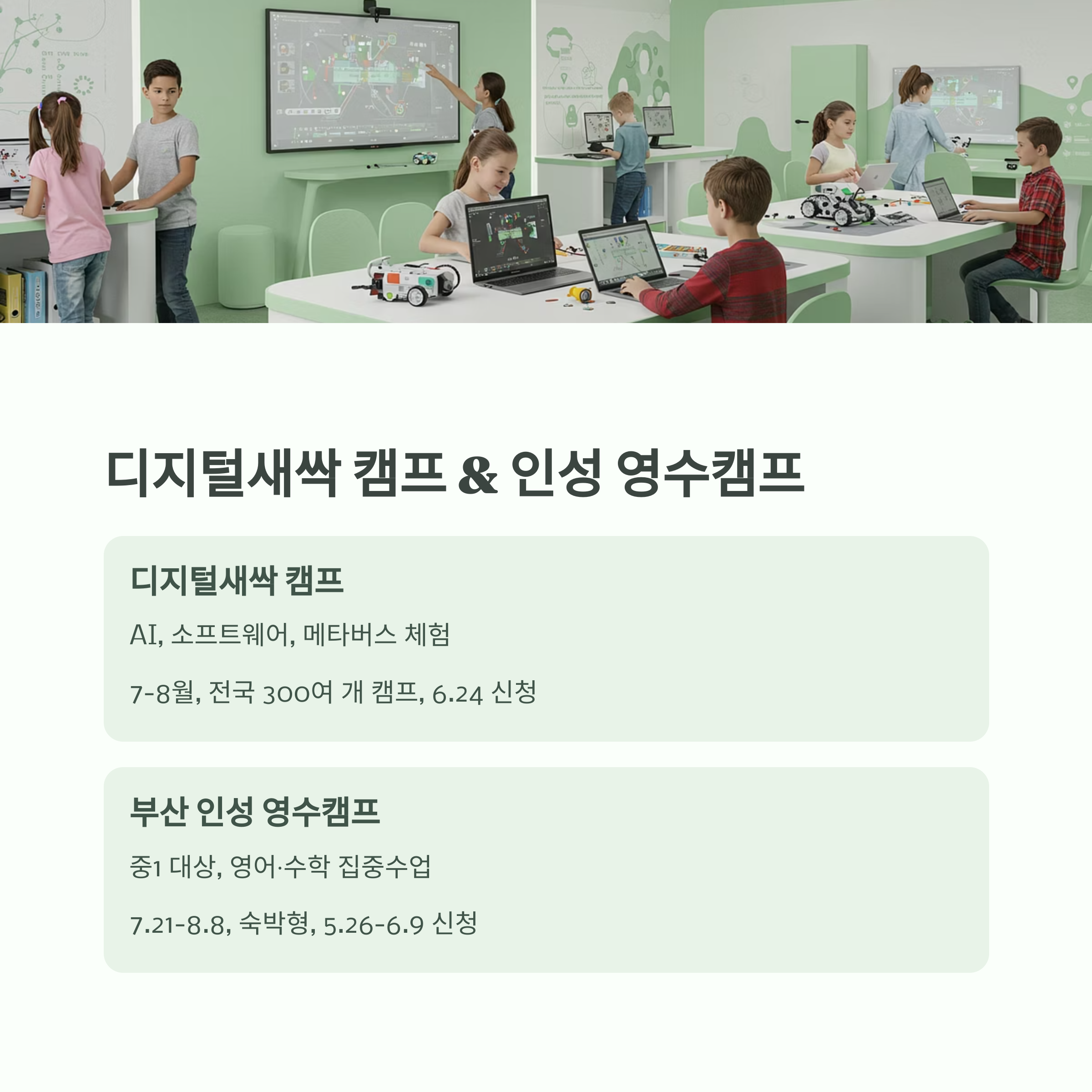 | 부산 인성 영수캠프 | 중1, 800명 | 7.21~8.8/3주 숙박 | 5.26~6.9(학교, 선착순) | 무료 | 영어·수학 집중, 진로·인성·야외체험 |