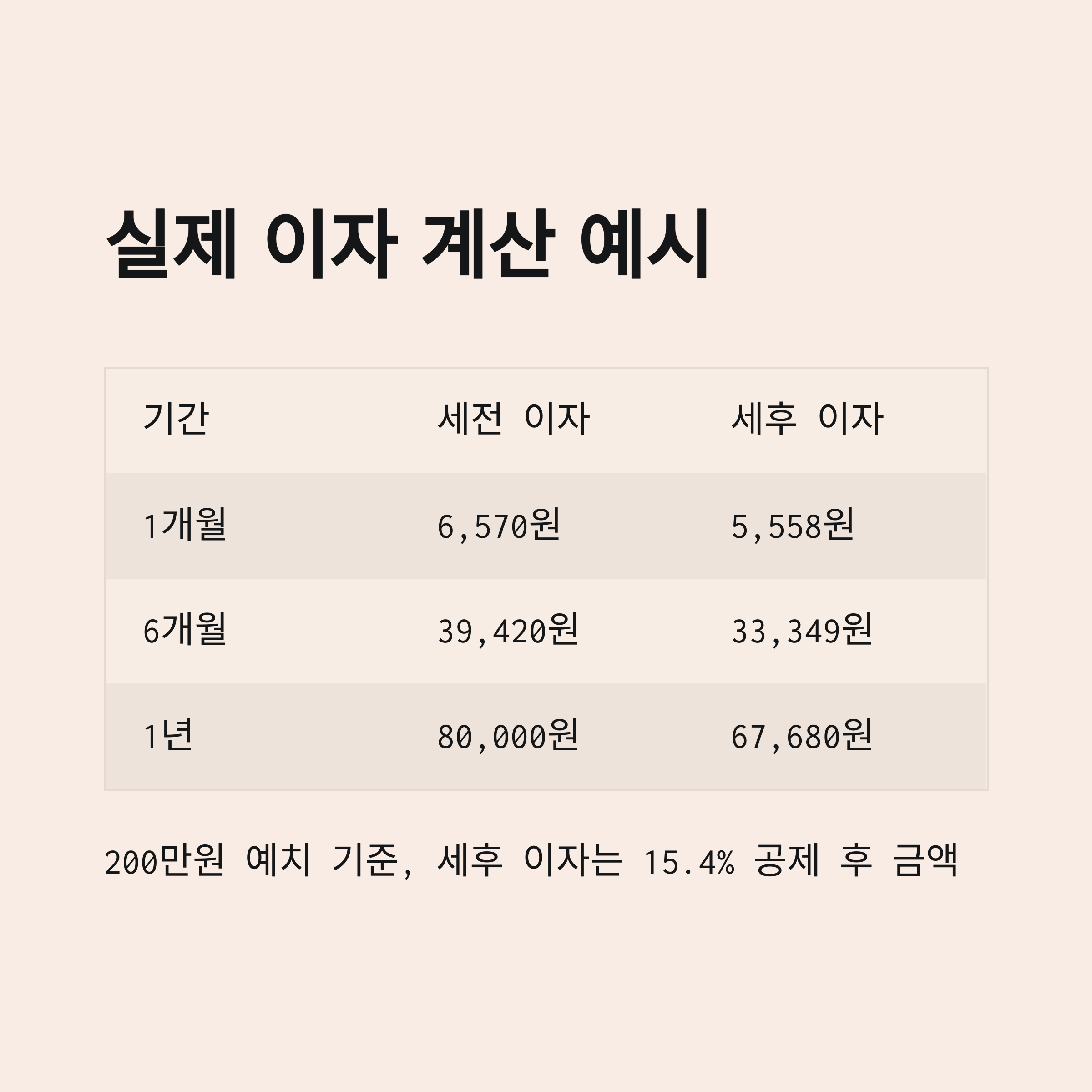 | 기간 | 세전 이자 | 세후 이자 (15.4% 공제) |