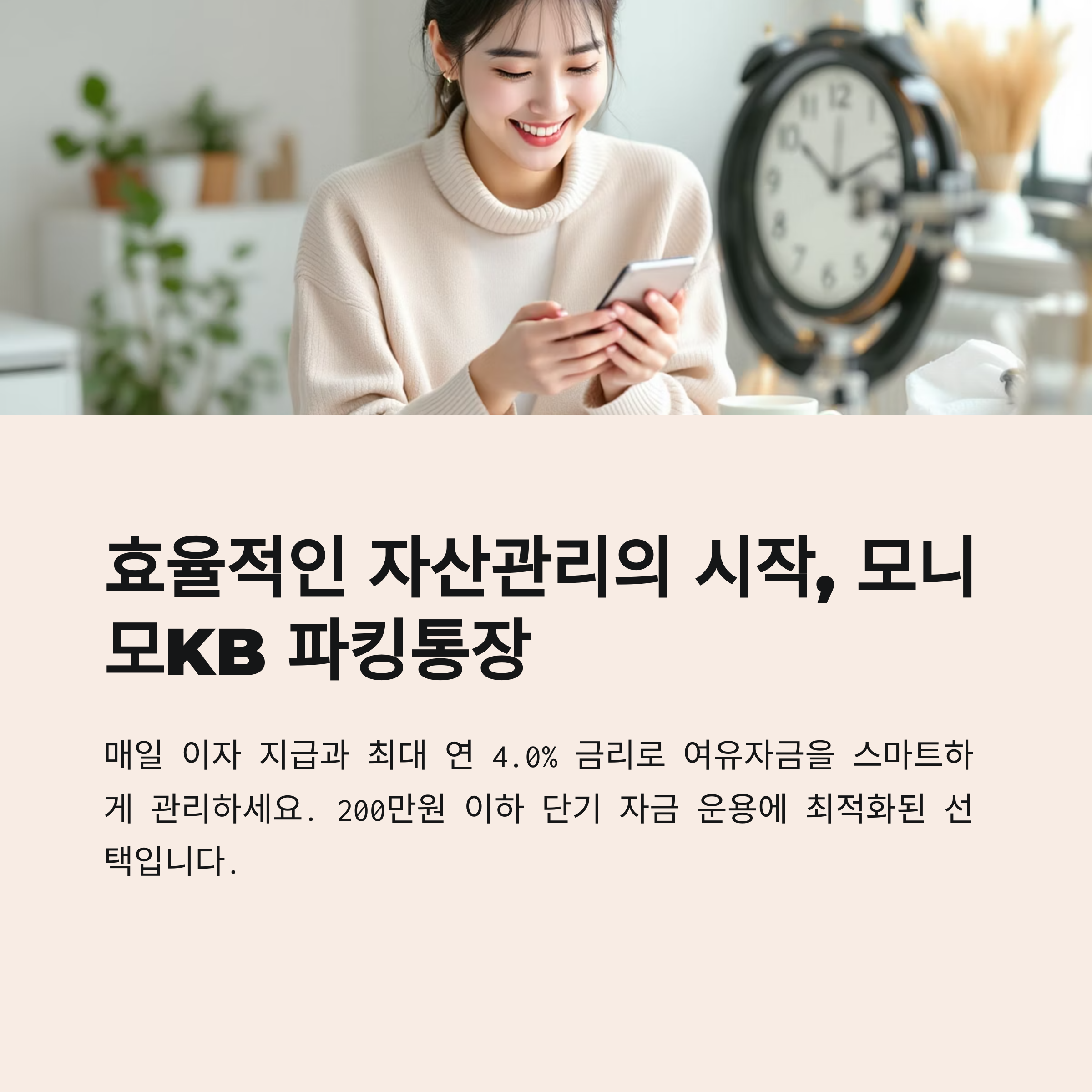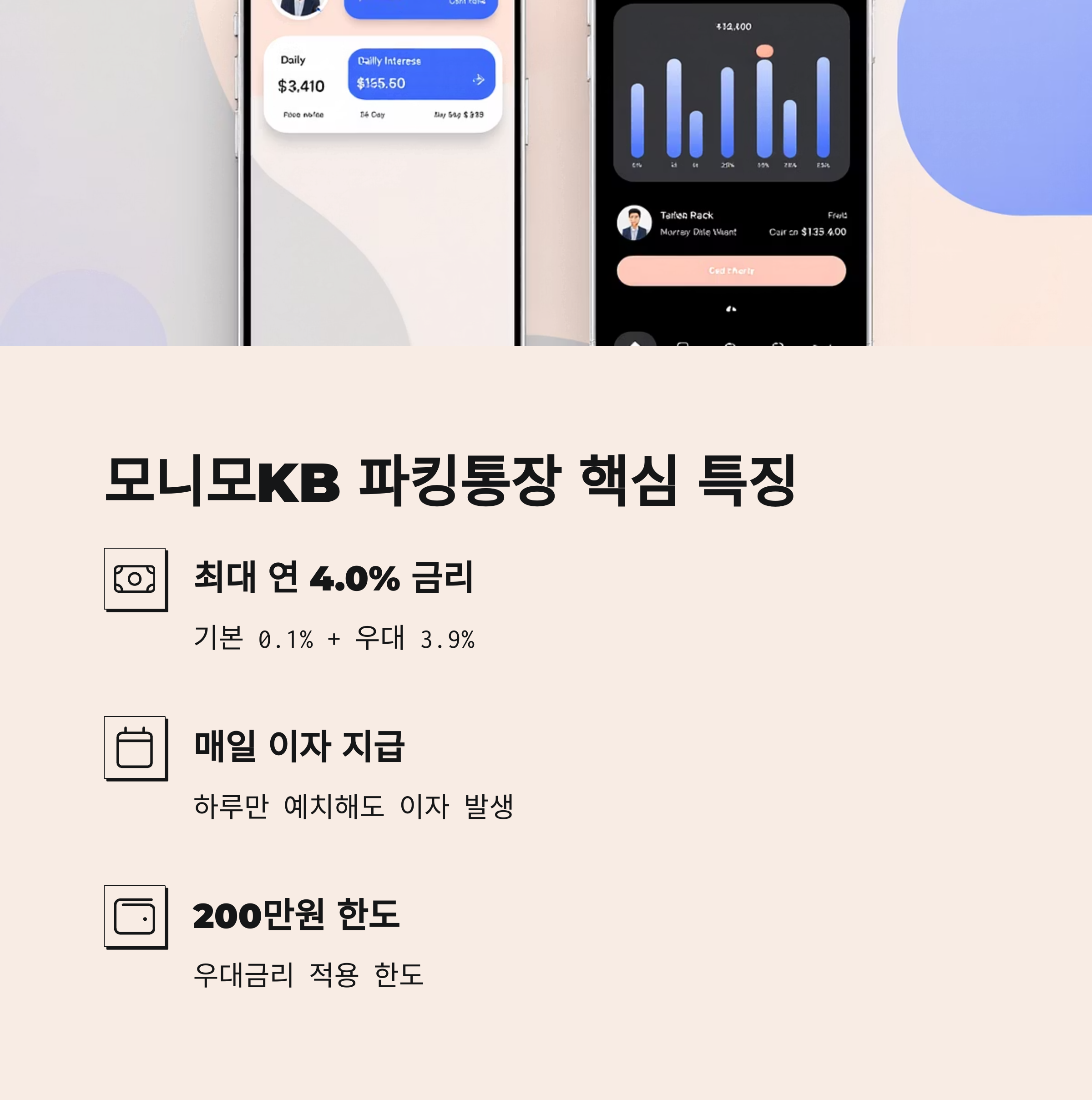 💰 모니모KB 파킹통장은 일 잔액 200만 원까지 최대 연 4.0%의 금리를 제공하며, 매일 이자 지급 방식으로 단기 자금 운용에 최적화된 통장입니다.