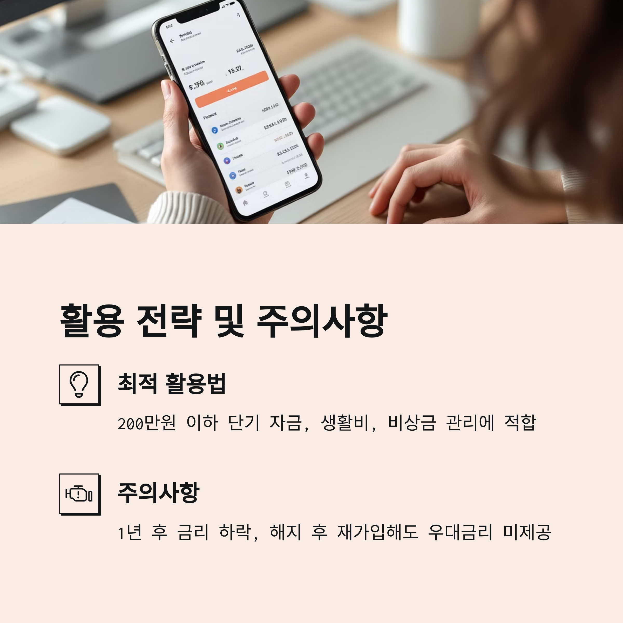 매일 이자가 지급되는 복리 효과까지 고려하면 실제 수령액은 조금 더 높아질 수 있습니다. 다만, 1년 이후에는 우대금리가 하락하므로 장기 운용 계획 시 참고하세요.