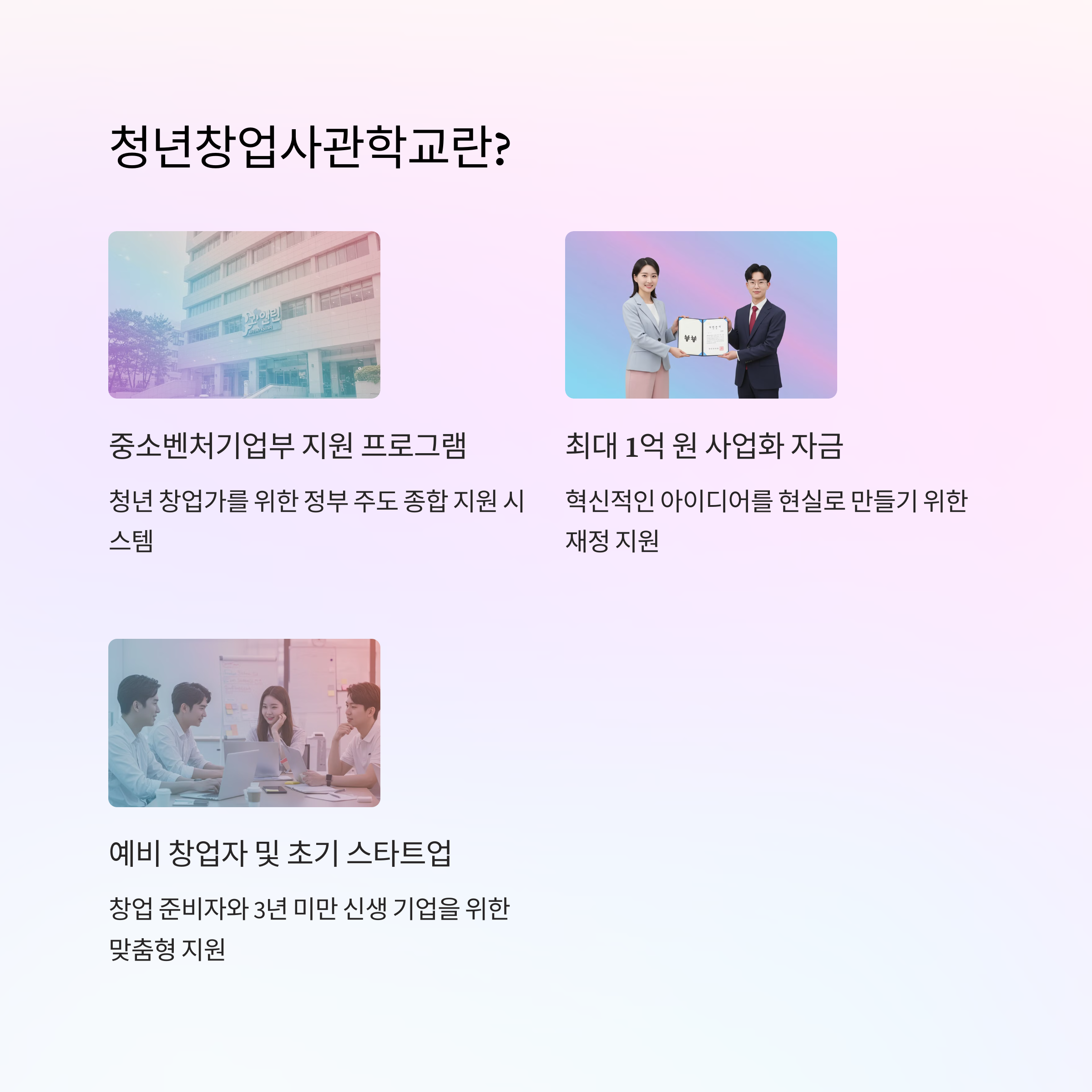 청년창업, 자금과 경험 부족으로 망설여지십니까? 청년창업사관학교는 든든한 동반자가 되어줄 것입니다. 중소벤처기업부와 중소벤처기업진흥공단에서 운영하는 창업 지원 프로그램입니다.