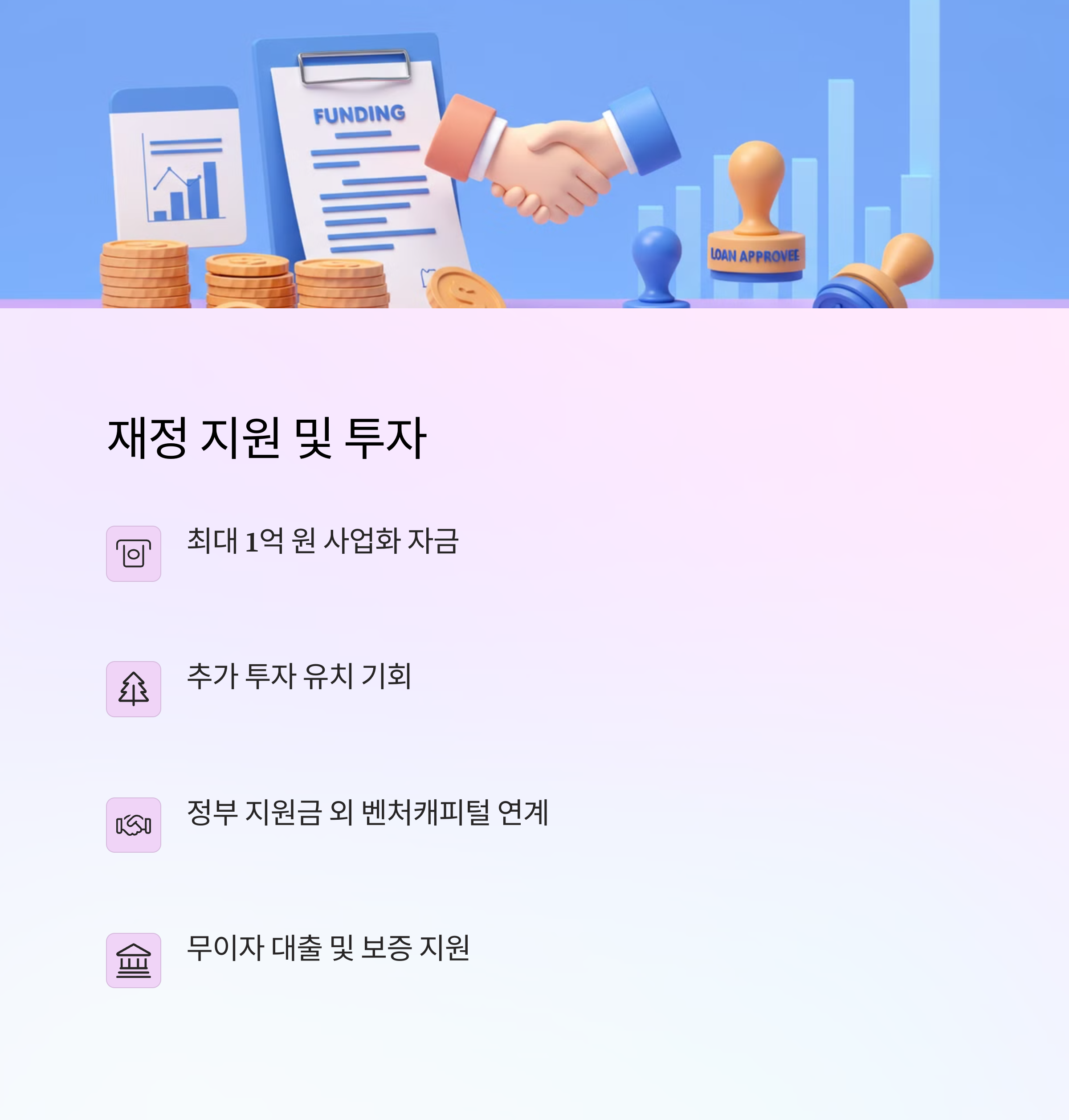 - 정책 자금 연계: 정부의 다양한 정책 자금 정보 제공 및 연계 지원