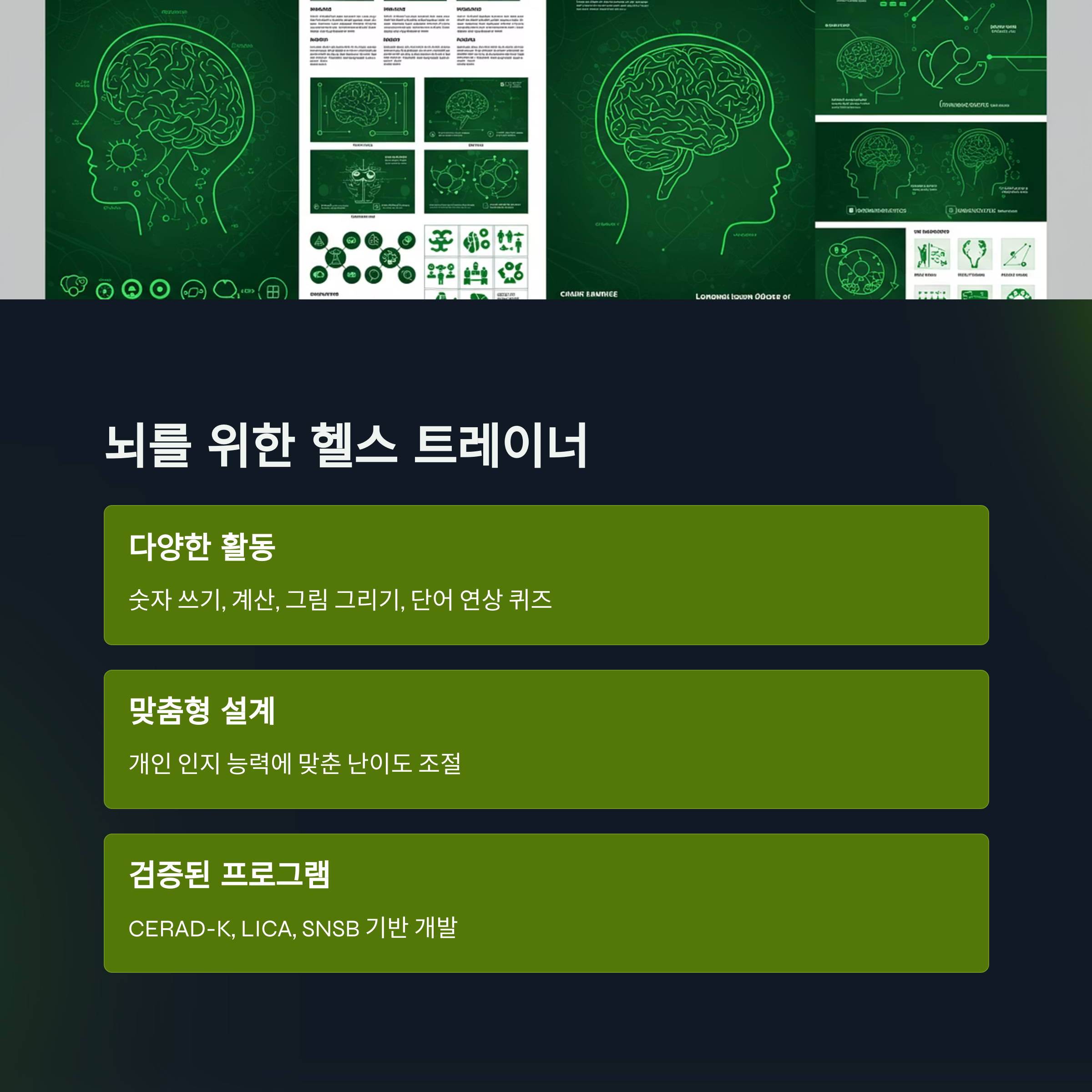 게다가 이 프로그램들은 아무렇게나 만들어진 게 아니에요. 국내 대표 인지검사 도구들인 CERAD-K, LICA, SNSB 같은 평가 방법을 준용해서 개발되었고, 심지어 특허 및 저작권 등록까지 완료된 프로그램이 많다고 해요. 진짜 믿고 사용할 수 있겠죠?