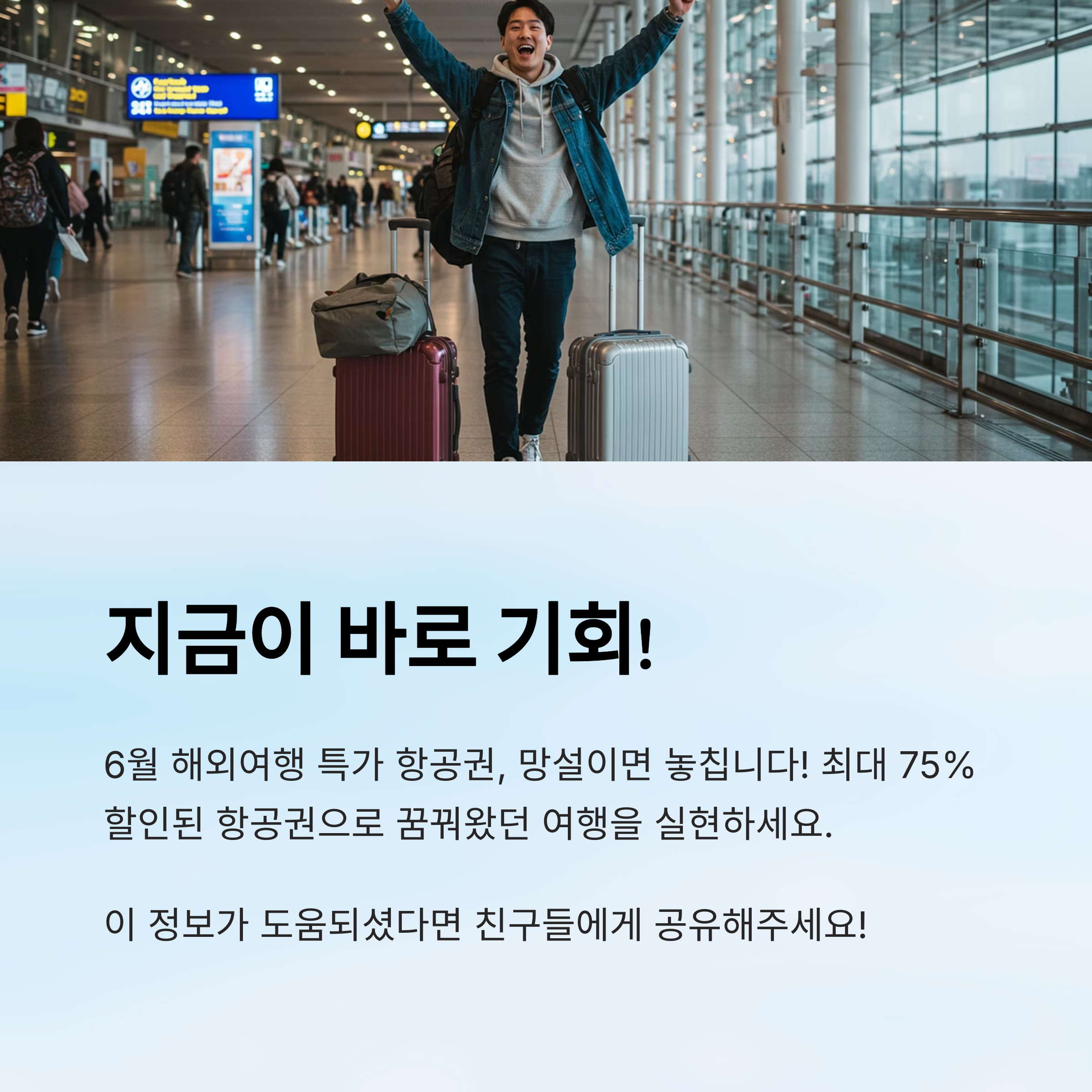6월! 생각만 해도 설레는 여름휴가 시즌이 다가오고 있네요! 하지만 치솟는 항공권 가격 때문에 해외여행은 꿈도 못 꾸고 계신 건 아니죠? 만약 그렇다면 오늘 제 이야기에 귀를 쫑긋 세워주세요! 놀랍게도 2025년 6월, 여름 성수기임에도 불구하고 해외여행 특가 항공권과 주말 특가가 쏟아지고 있다는 사실! 와, 정말 솔깃하지 않나요? 오늘은 제가 최신 데이터와 실제 특가 예시, 그리고 여행 고수들만 아는 알짜배기 준비 팁까지 꼼꼼하게 숫자로 정리해서 알려드릴게요. 저만 믿고 따라오시면 꿈에 그리던 6월 해외여행, 상상 이상의 최저가로 떠날 수 있답니다!