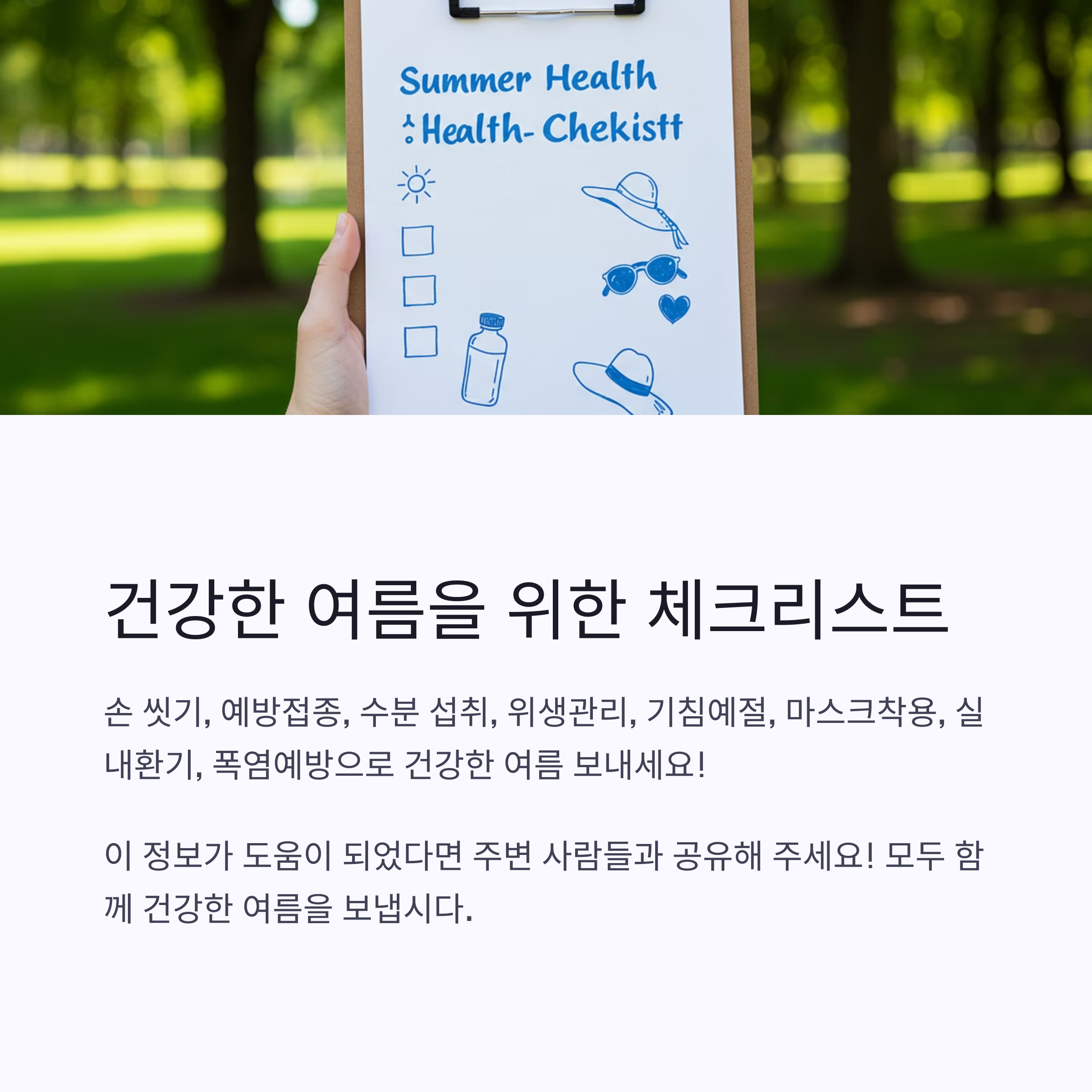 지금까지 말씀드린 예방법들을 한눈에 보기 쉽게 주요 데이터와 함께 정리해 봤어요. 이 체크리스트를 통해 여러분의 여름철 건강 습관을 점검해 보세요!